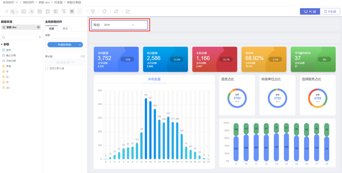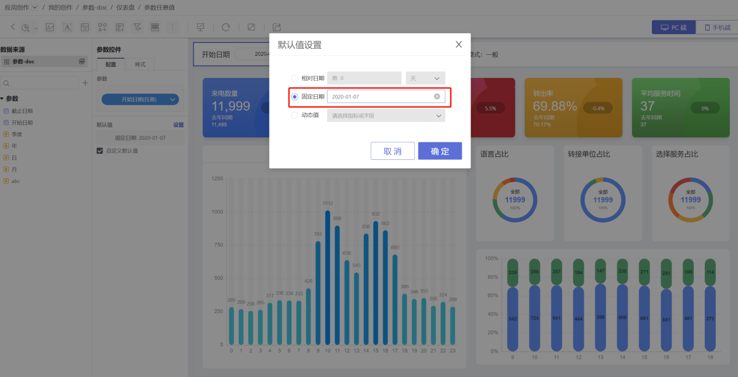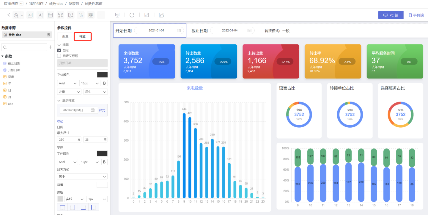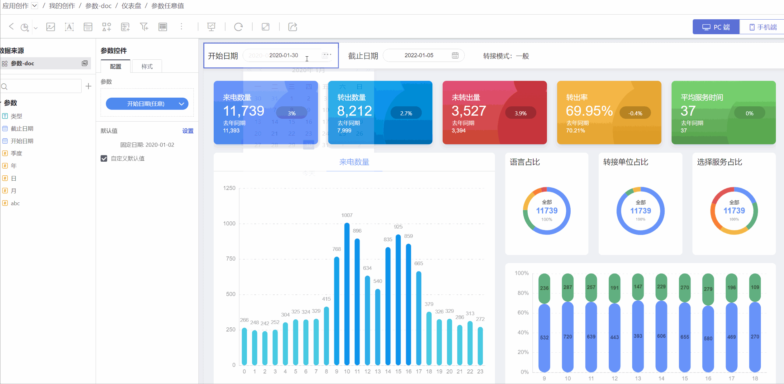 如果创建图表的数据集没有使用参数,那么可以在创建图表过程中通过图内过滤器将该图表与参数关联起来。 如图所示,在来电开始时间的过滤器中,使用参数表达式进行过滤,这样将参数图表关联起来。 参数控件变化时,过滤器的值发生变化,从而影响图表的显示。