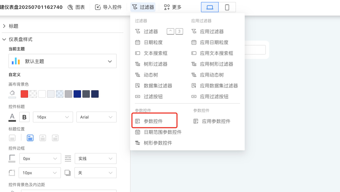 新建参数控件->参数控件图标,在仪表盘中添加一个参数控件。