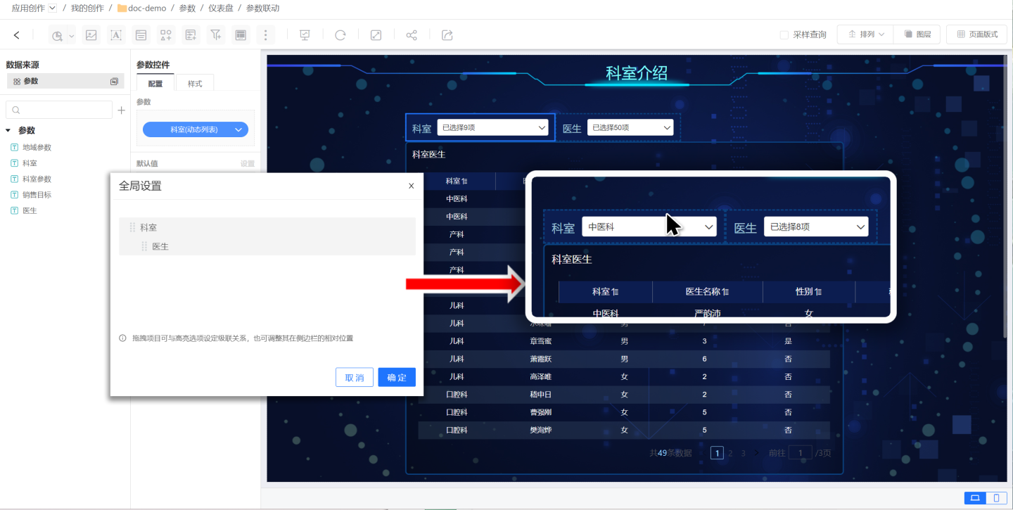 当多个参数使用同一数据集中不同字段做参数动态允许值时,这些参数之间是有联动关系的。 在全局设置中拖动参数控件,建立层级关系,当父级选项变化时,子级选项跟随变化。