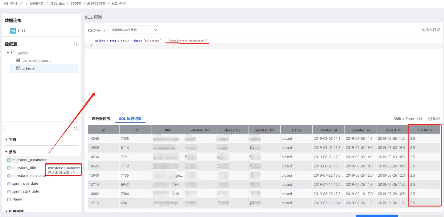 SQL 语句中参数统一采用{{%%参数名}}的方式,此时仅对参数进行文本替换,不校验类型。 如图所示,通过参数milestone_parameter筛选milestone为2.5的数据。