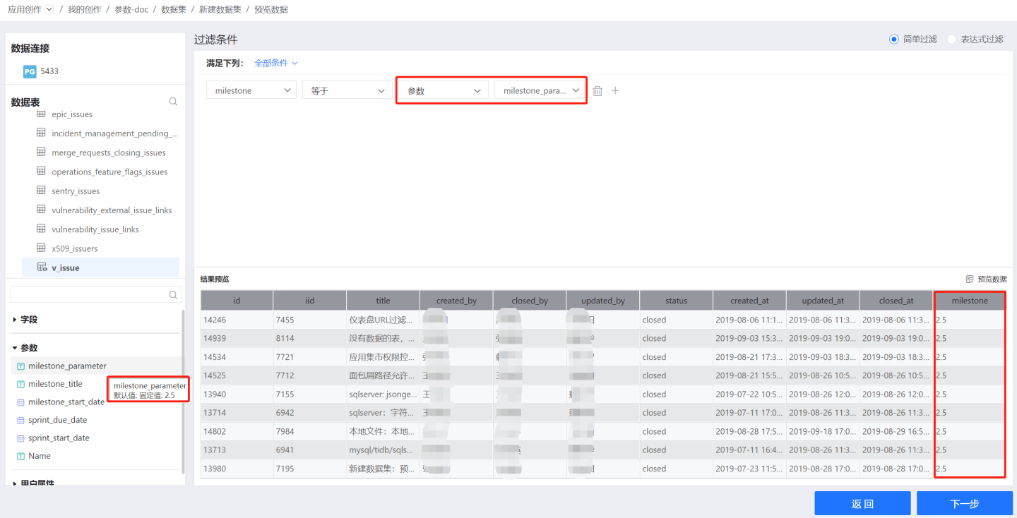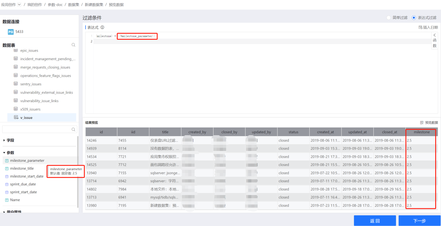 表达式过滤中使用参数时可以点击左侧下方的参数将其填充到表达式文本框中。如图所示,参数milestone_parameter的默认值为2.5,使用表达式{milestone} = {{%milestone_parameter}}对数据进行过滤,筛选出 milestone 为2.5的数据,创建新的数据集。
