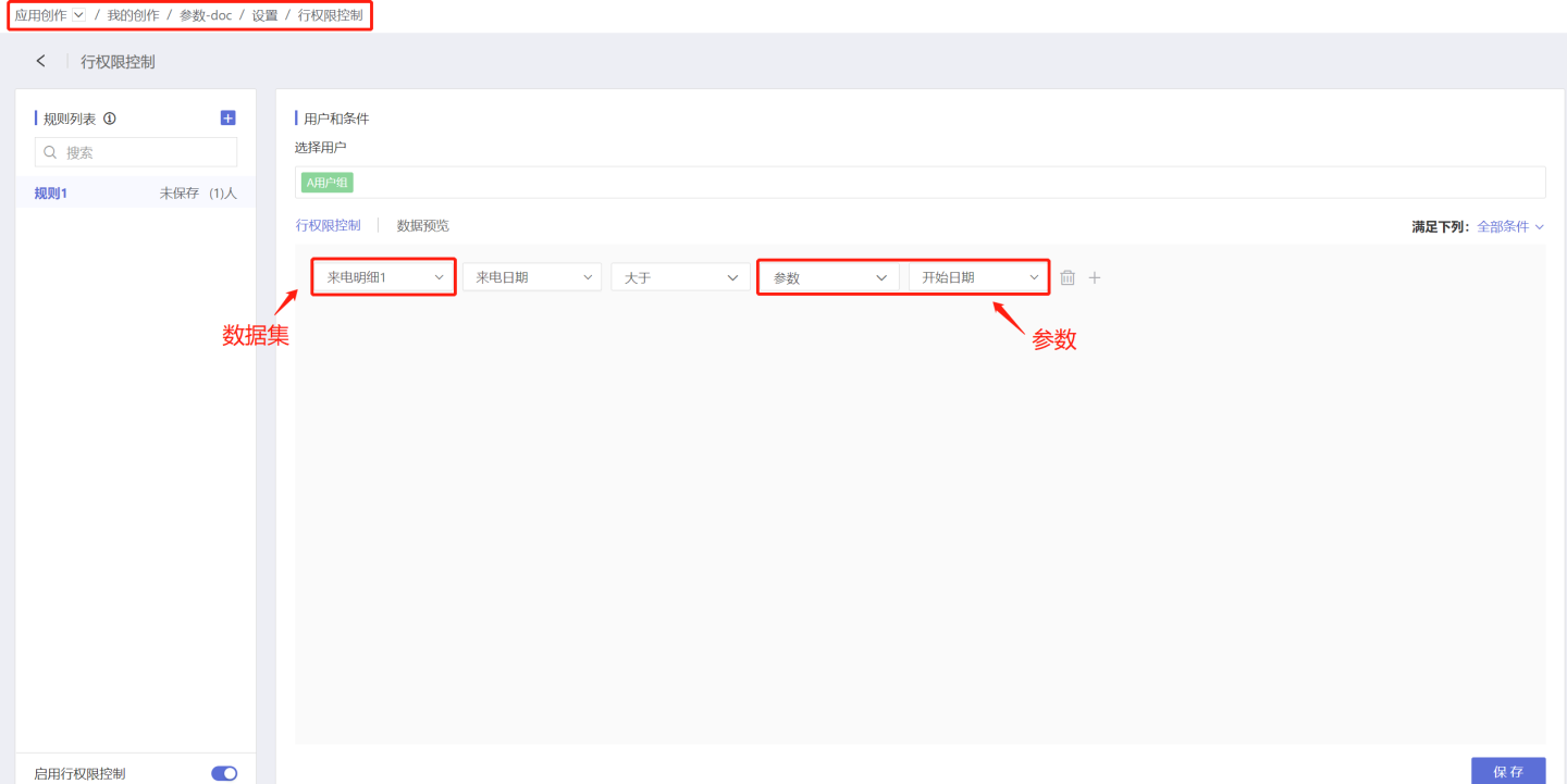 数据行权限可以使用参数动态地控制用户使用数据的范围。如图所示,通过参数控制数据集来点明细1对 A 用户组开放的数据内容,当参数值开始日期变化时,A 用户组看到的内容也随之变化。
