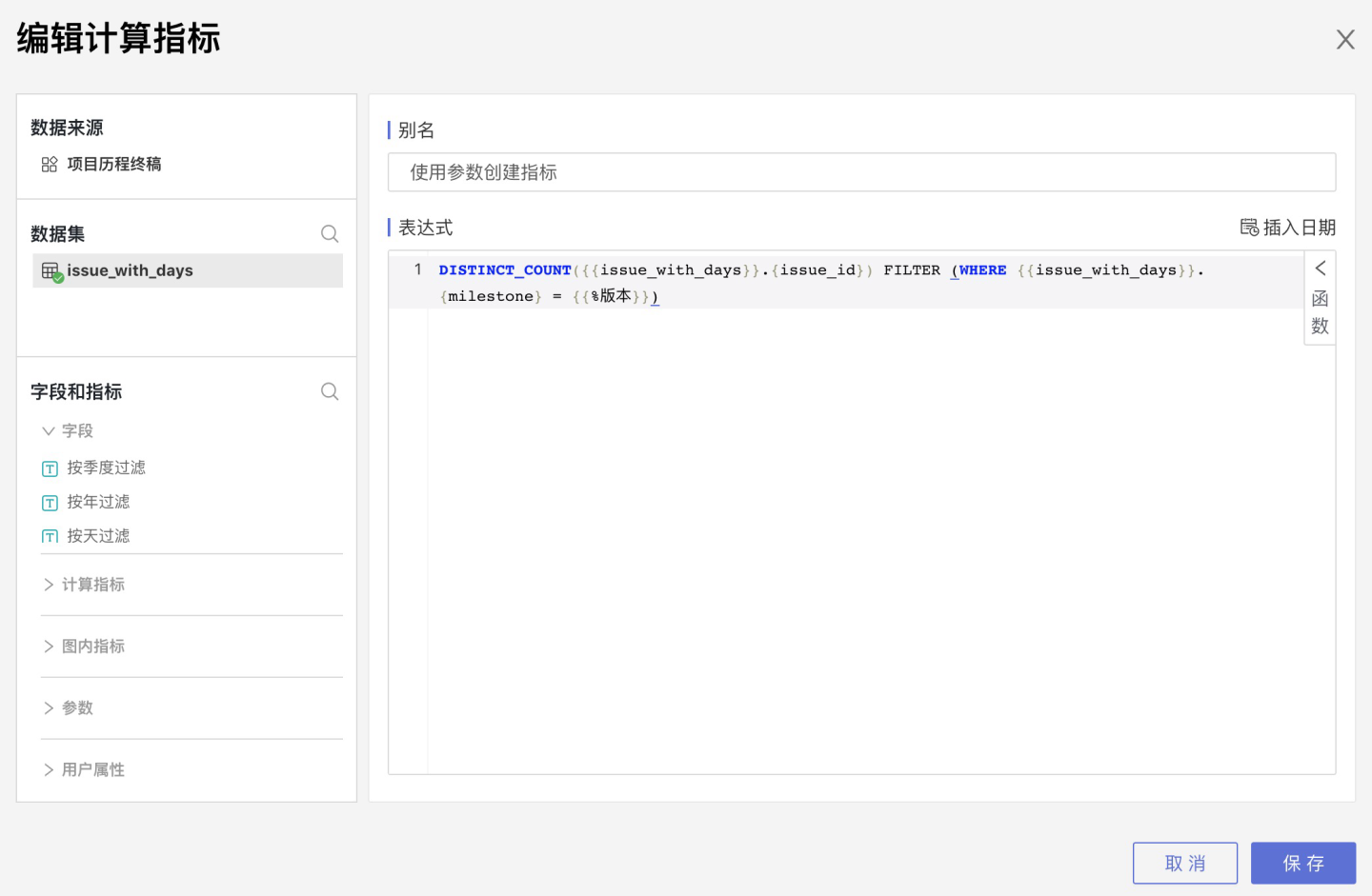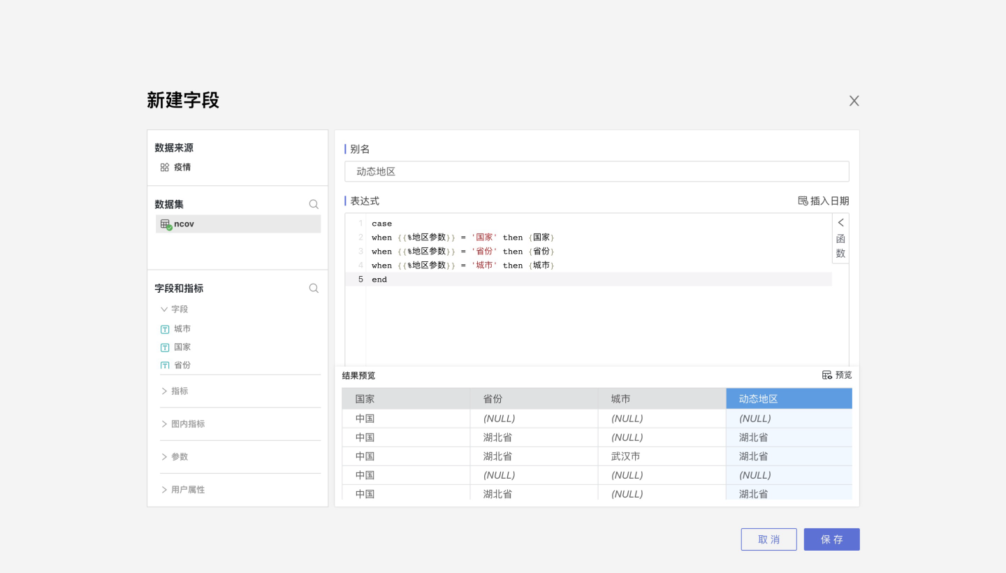 数据集中新建字段和新建指标时,可以使用参数编辑字段和指标内容。