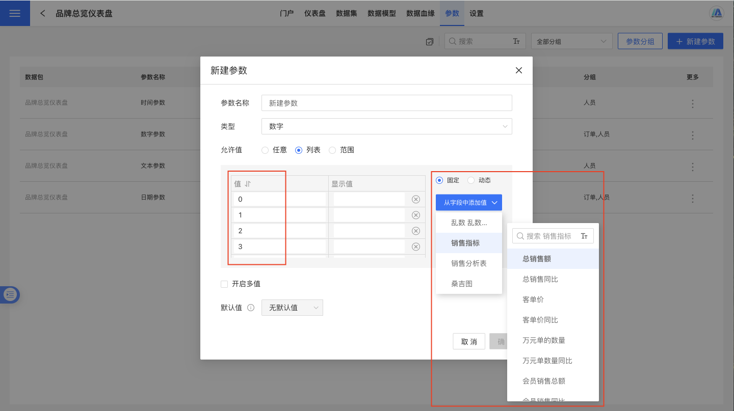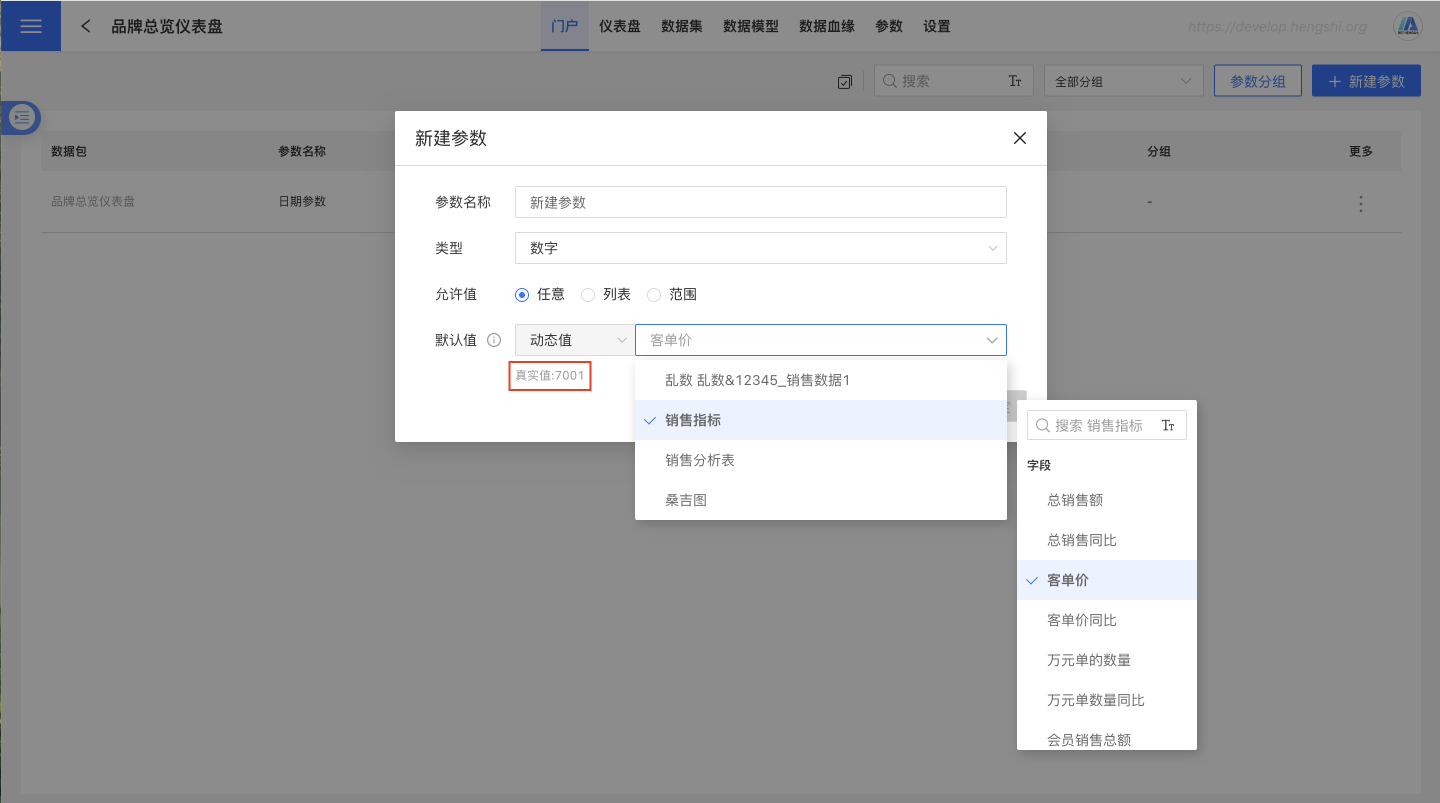 从该应用中所有数据集中选取相应类型的字段作为默认值,当数据集字段的取值变化时,参数默认值随之发生变化。如图所示,选取该应用中销售指标数据集中的客单价字段作为默认值,默认值为7001,当数据集更新时,或不同权限的用户使用时,默认值也会不一样。
