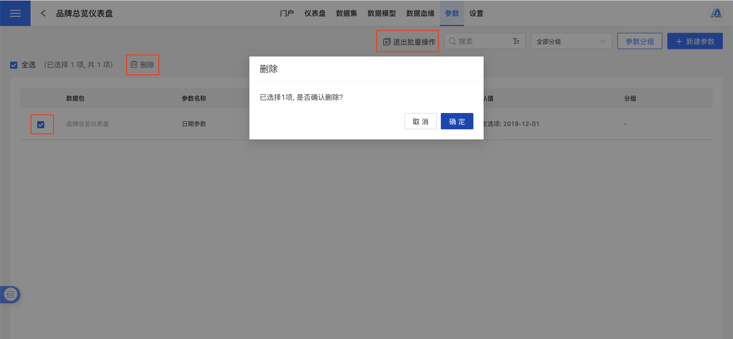 点击工具栏中的批量操作按钮,进入批量操作模式,列表首列将会出现勾选框,可以勾选多个想要删除的参数后,点击删除进行批量删除。