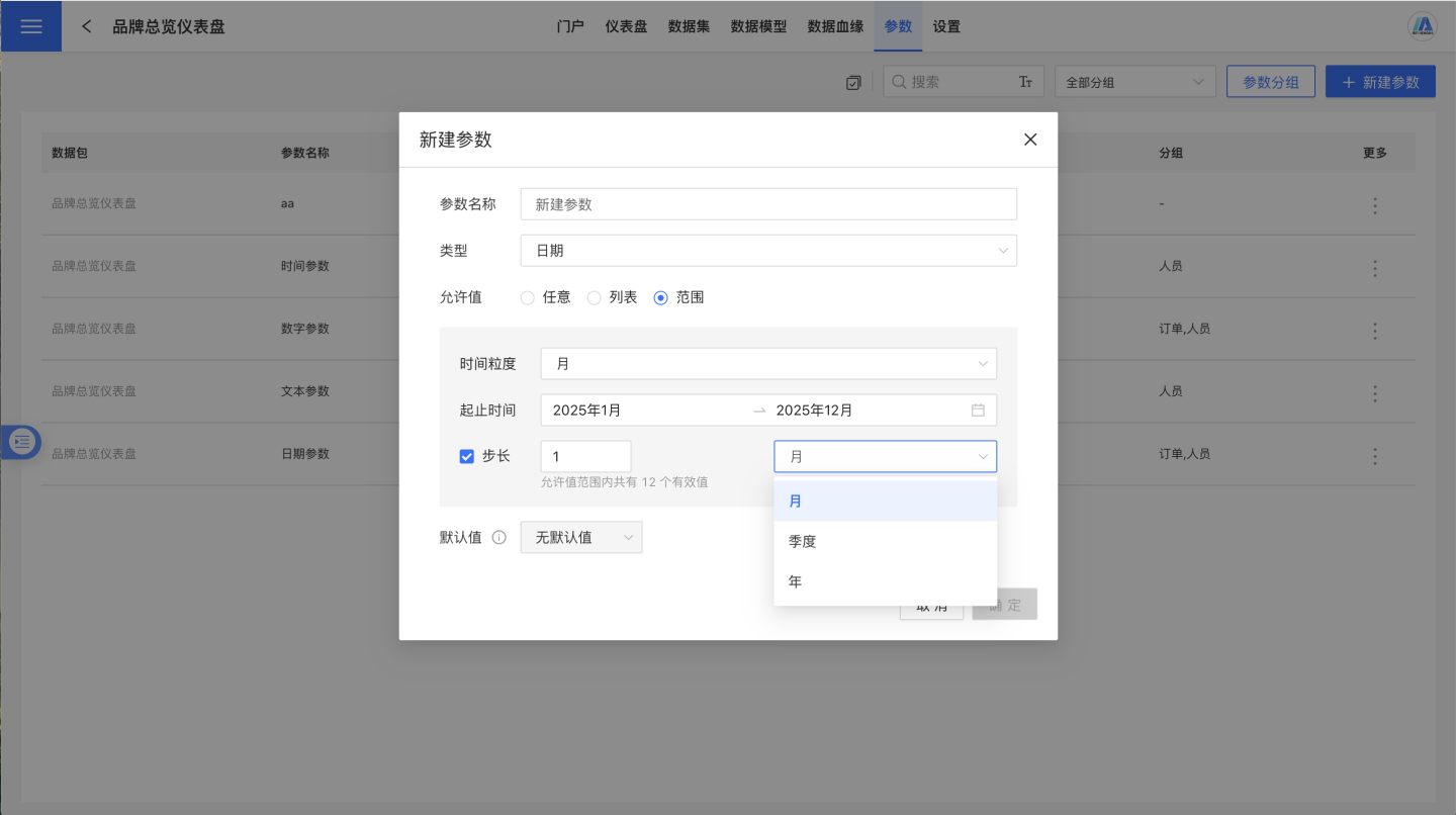 日期、时间参数的范围值需要设置粒度、开始、结束和步长。