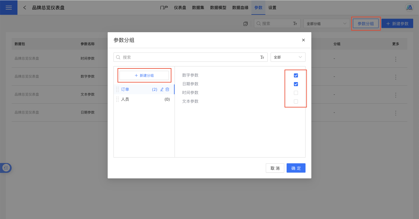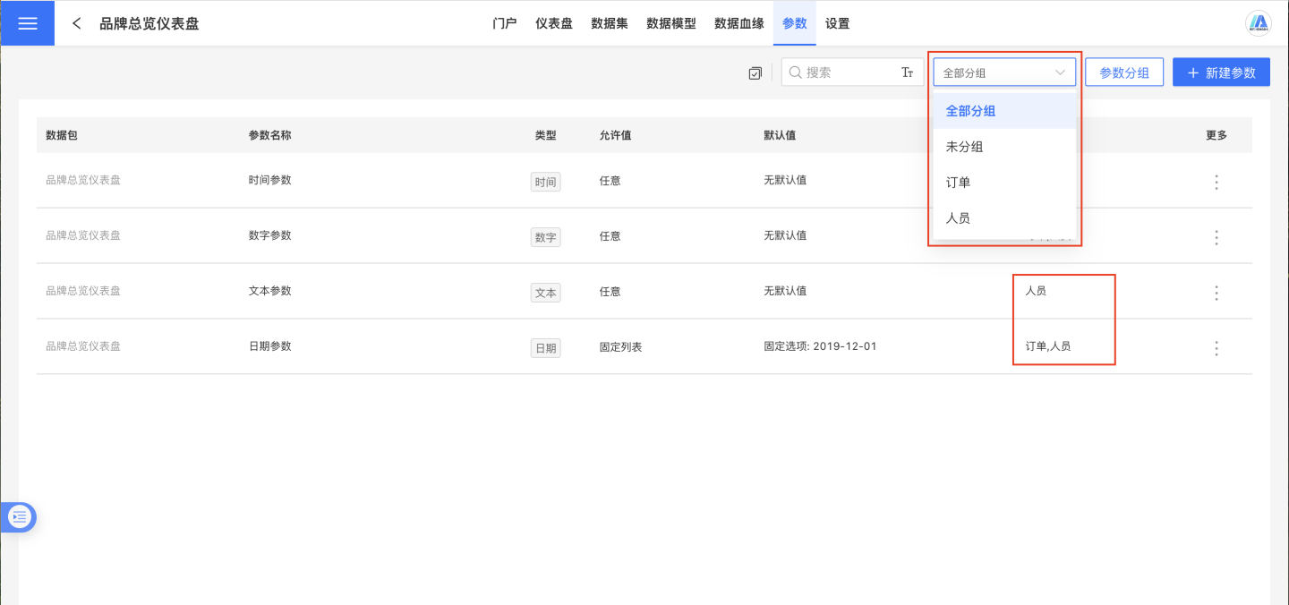 参数支持分组展示,将相关业务含义的参数分成一组,方便数据分析过程中查找和使用。