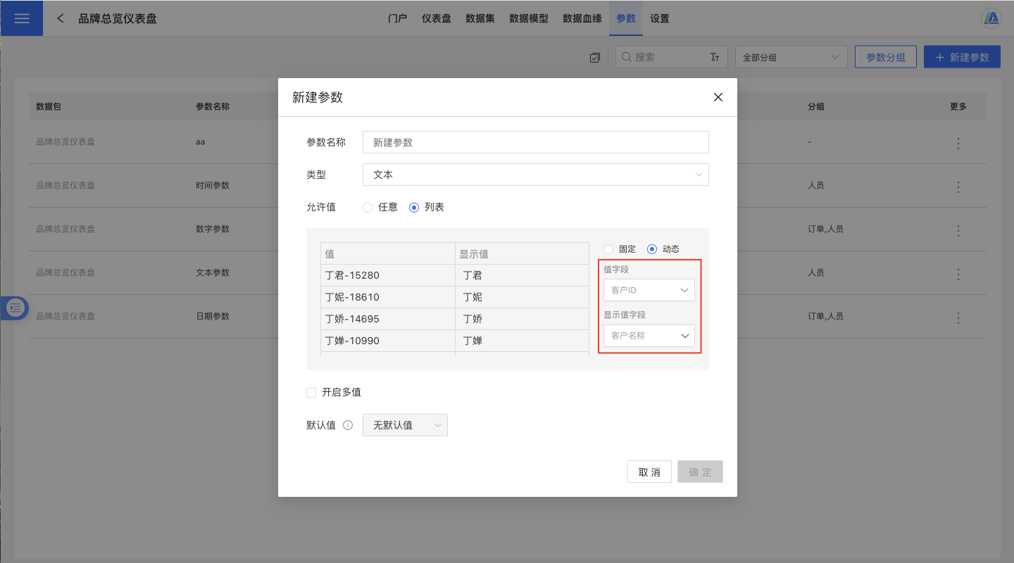 动态列表中的值和显示值是数据集中的字段内容,如果该数据集设置了行权限,不同权限的用户看到的参数值不同。