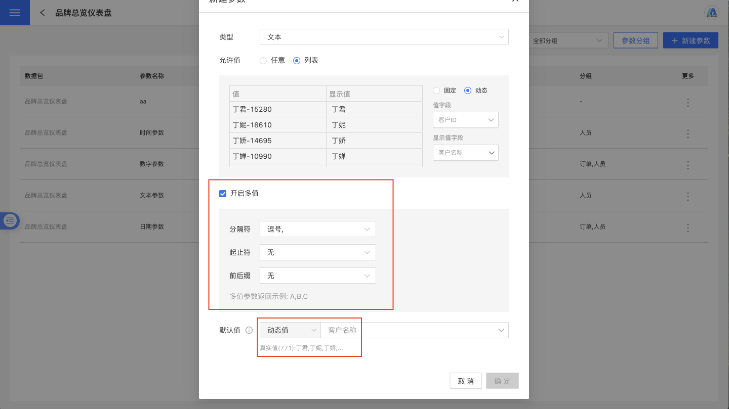 当参数允许值为列表时,参数可以开启多值功能。可以设置参数多值的分隔符、起止符、前后缀。参数多值开启后,可以设置多个默认值。
