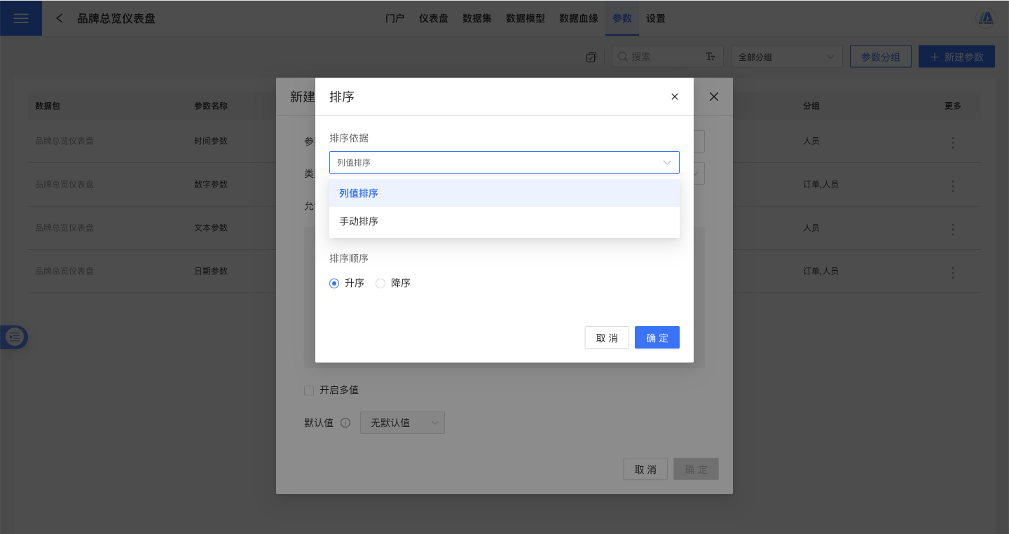 固定列表支持值排序,点击排序按钮弹窗排序弹窗,可以设置排序依据和顺序。