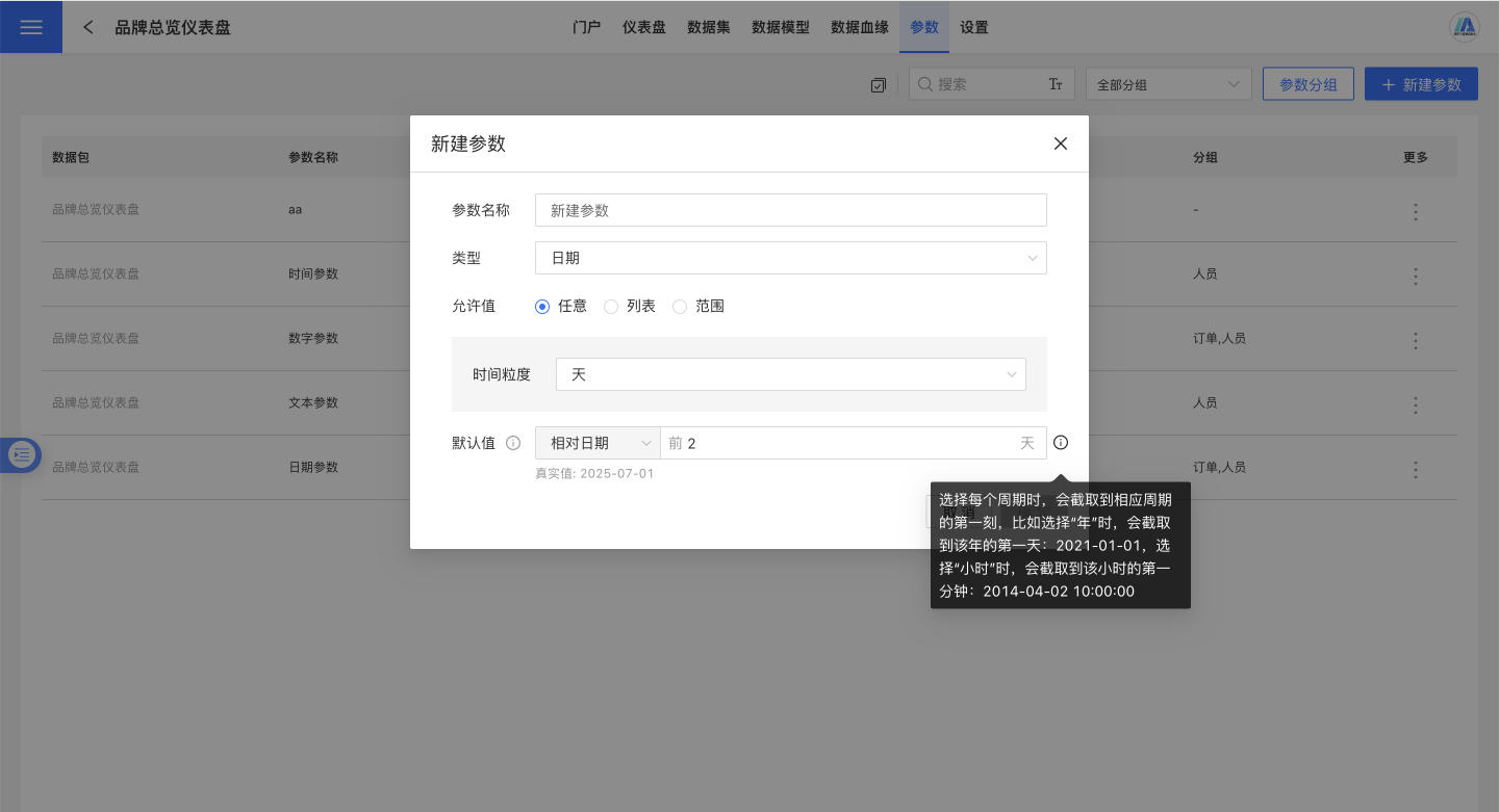 日期参数和时间参数的默认值可以设置相对值。相对是指相对于系统的当前日期、时间,会随着时间而变化。如图所示,时间参数的默认值设置为相对日期前1天。当系统日期为1月2日时,参数默认值为1月1日,当系统日期为1月3日时,参数默认值为1月2日。