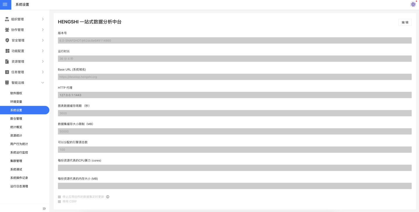 HENGSHI 在设置->智能运维->系统设置页面中展示了系统运行时的一些参数,包括主程序相关信息,Base URL、HTTP 代理、图表数据缓存周期、数据集缓存大小、租户引擎等相关信息。