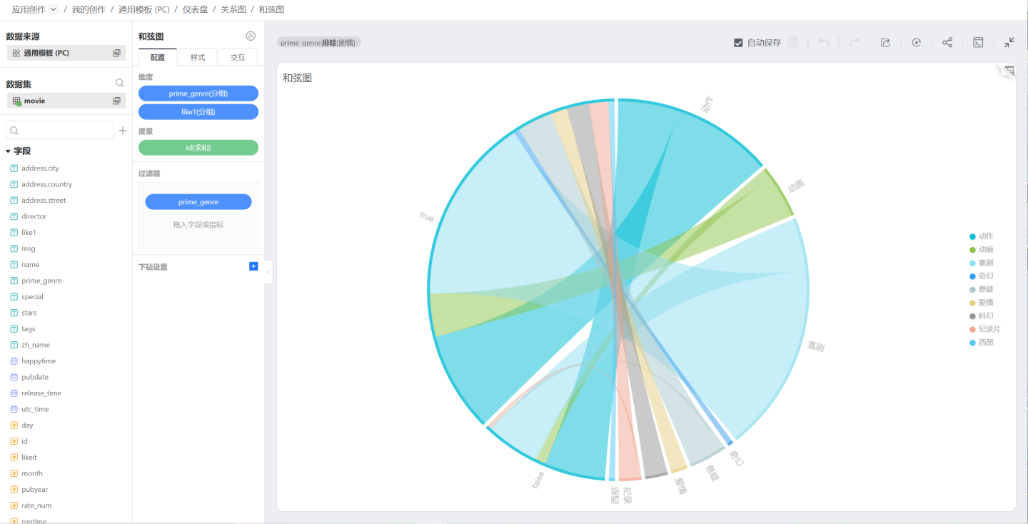 和弦图是一种显示矩阵中数据间相互关系的可视化方法,节点数据沿圆周径向排列,节点之间使用带权重(有宽度)的弧线链接。