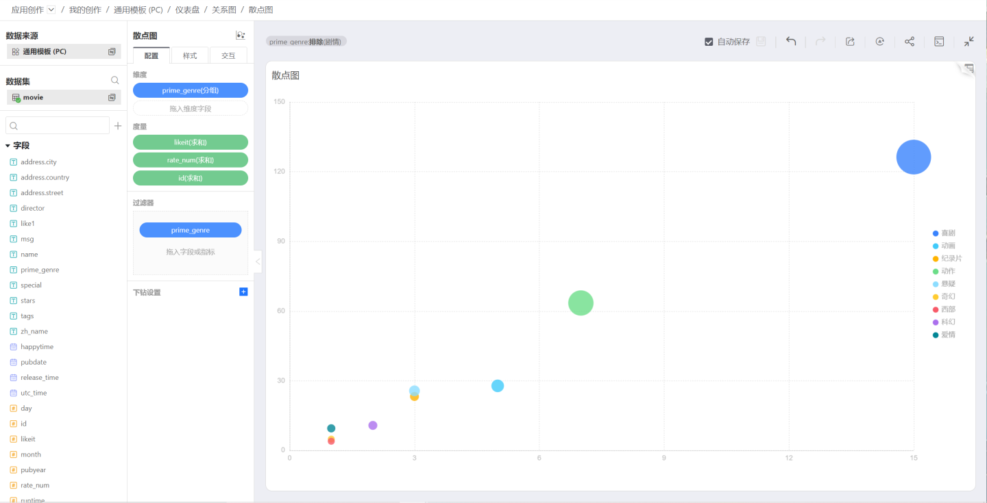 散点图比较特殊在于只有一个维度用作分类(或分组),但是可以表示三个度量,分别在 x 轴,y 轴和 size,其中 size 这个是可选的,因此用来表达类似 Gartner 的竞争象限非常合适。
