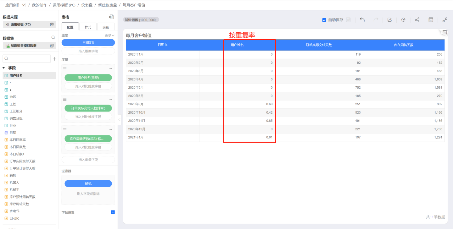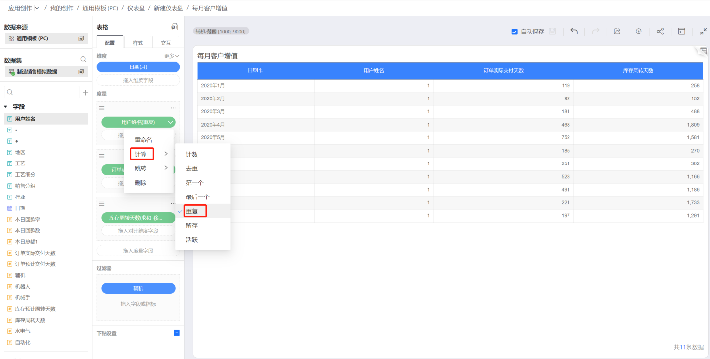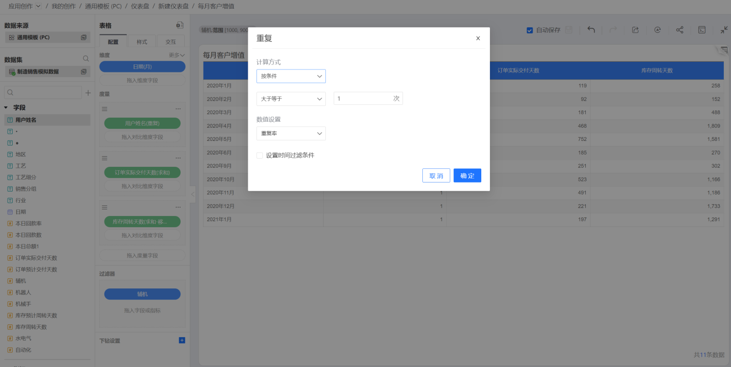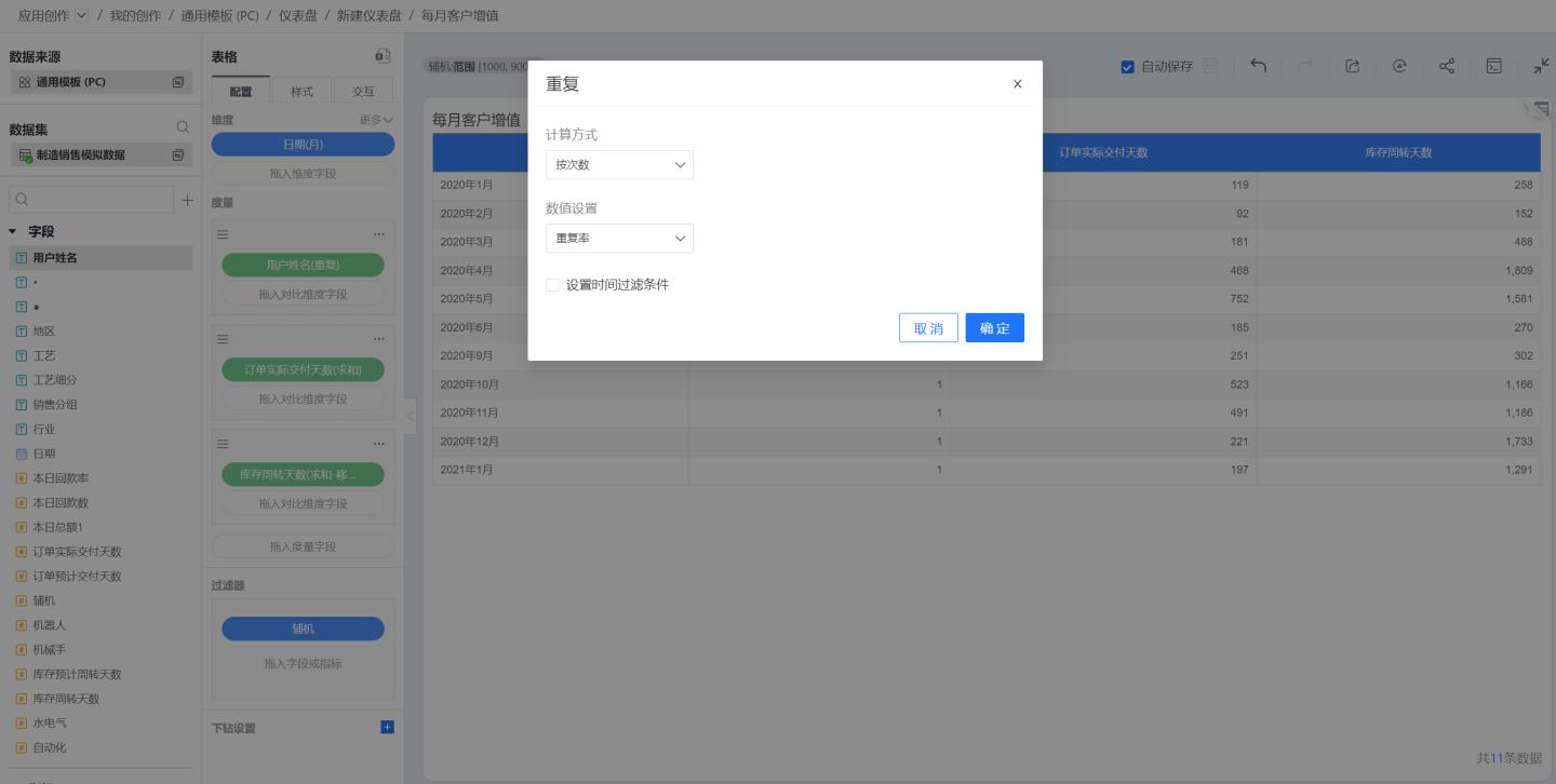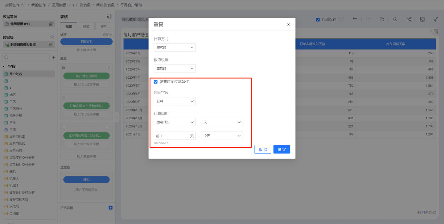 重复计算支持指定时间字段和时间过滤条件,从而计算特定时间的重复数/重复率。