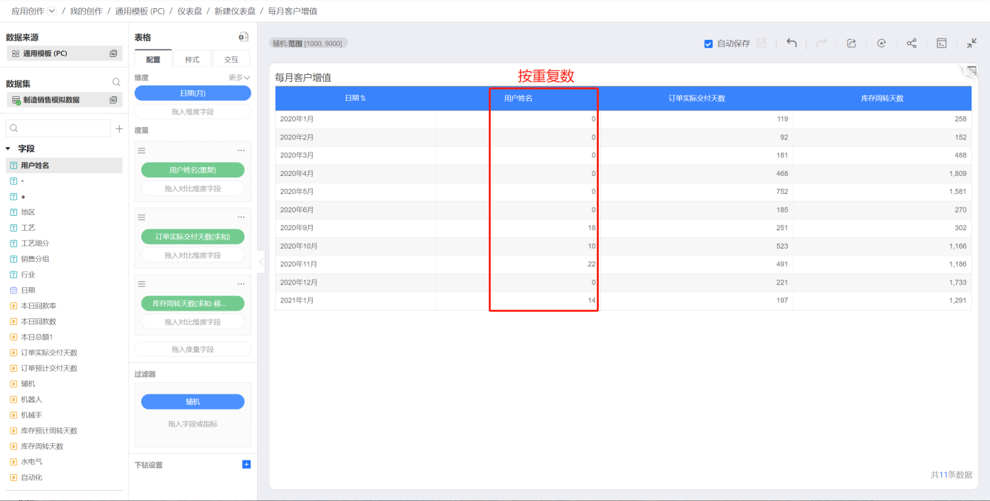 按次数会统计在该维度下度量的重复次数,一个度量只出现一次,重复次数为0,出现两次,重复次数为2。