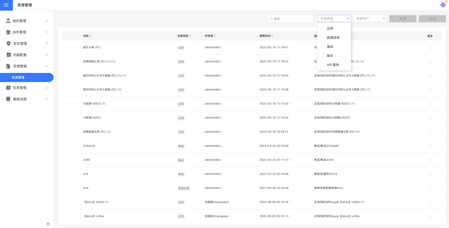 系统管理员可以点击设置 -> 资源管理 进入资源管理列表页,过滤查看任意用户的资源。支持管理的资源包括应用、数据连接、数据集成、数据科学、数据网关、API 服务。