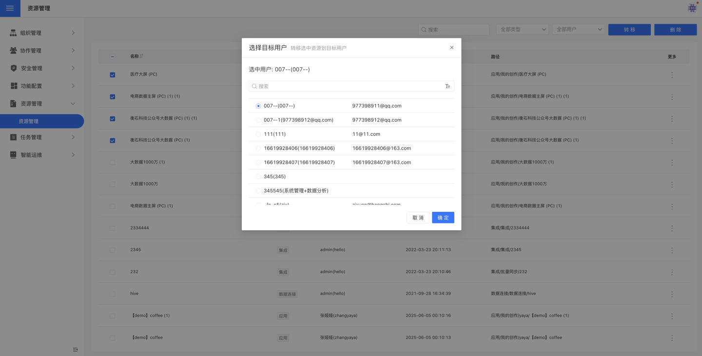 在上述资源列表,系统管理员可以过滤、选择资源,点击“转移”操作,将选中资源转移给目标用户。