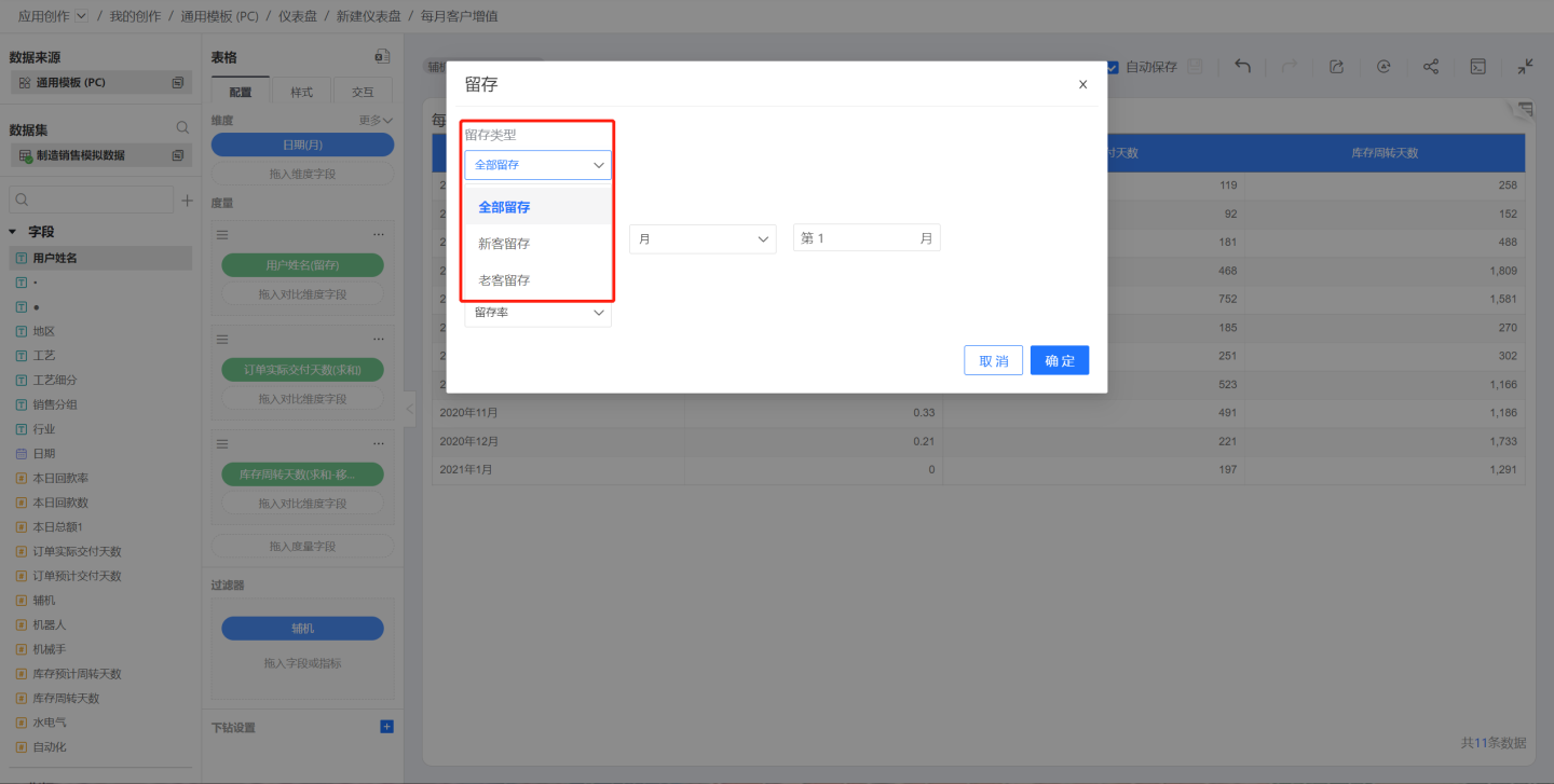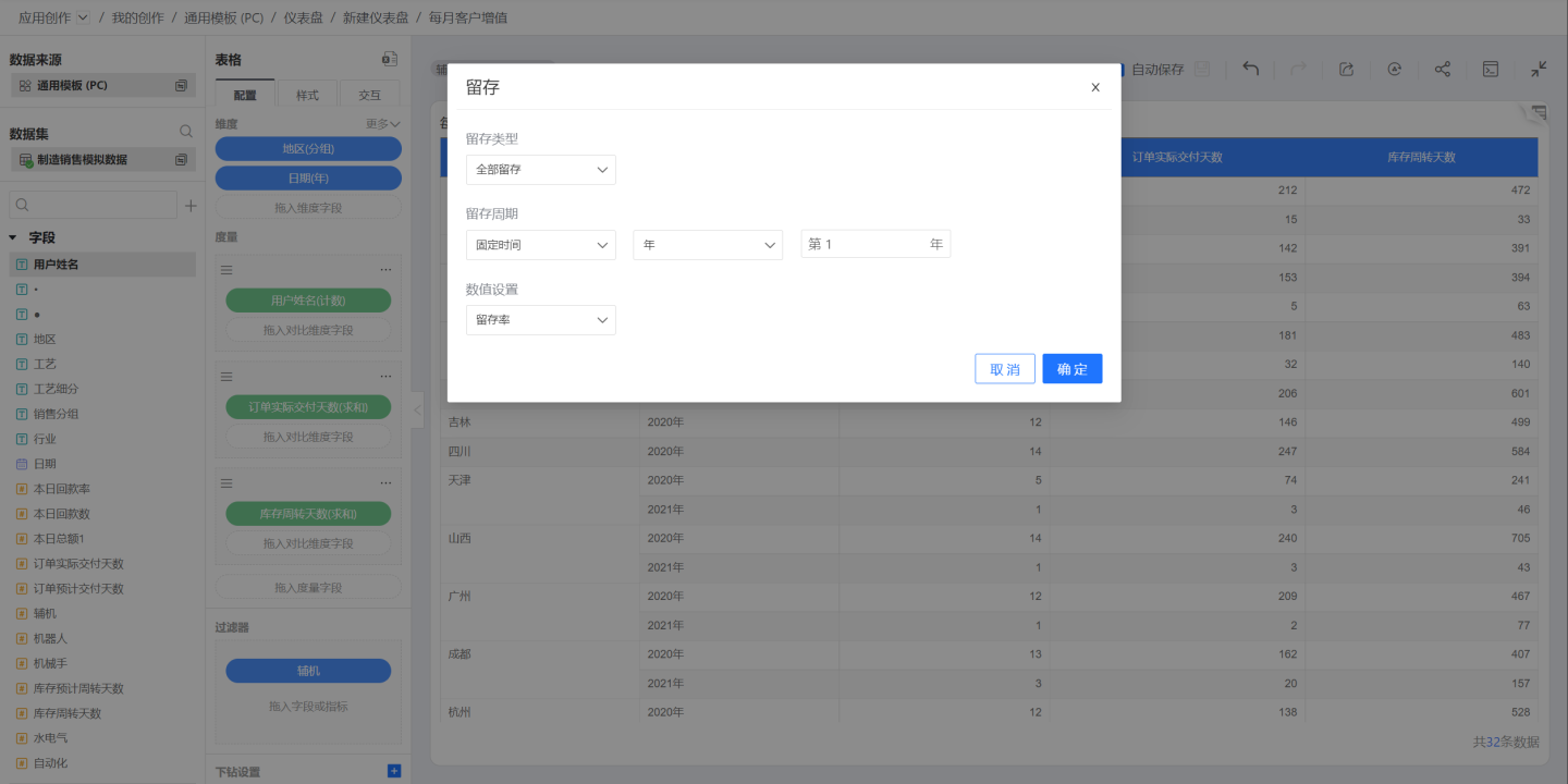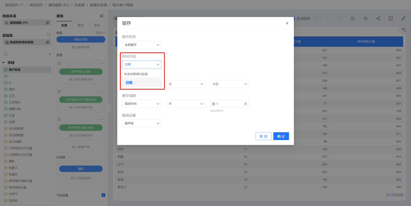 当维度字段中不包含时间信息时,留存计算设计页面如下, 需要选择留存计算的时间字段,然后配置留存周期,留存周期最小日期维度聚合方式是“天”,最大聚合方式是“年”。