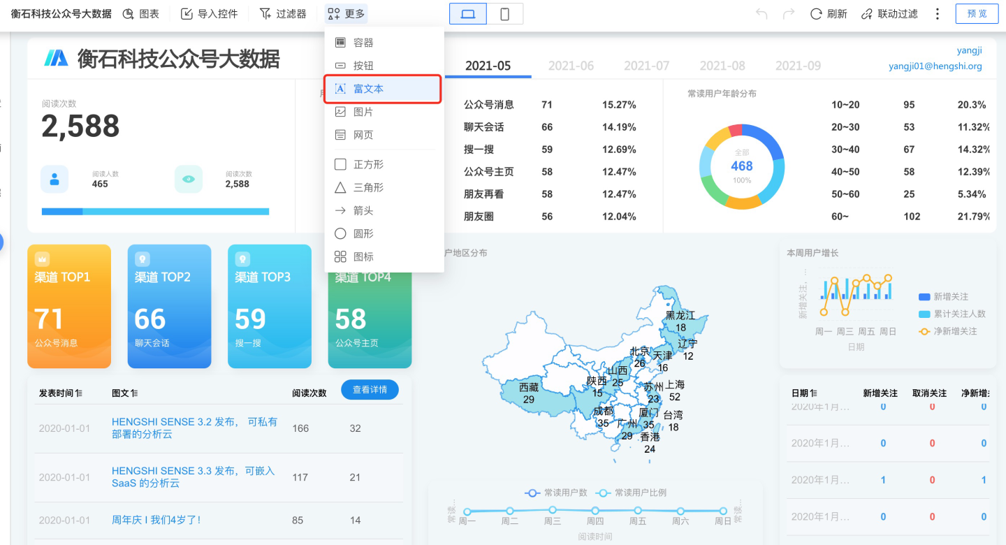 富文本控件是一种常见的控件,可用来展示文本信息、用户属性信息,在数据分析中起到辅助分析的功能。