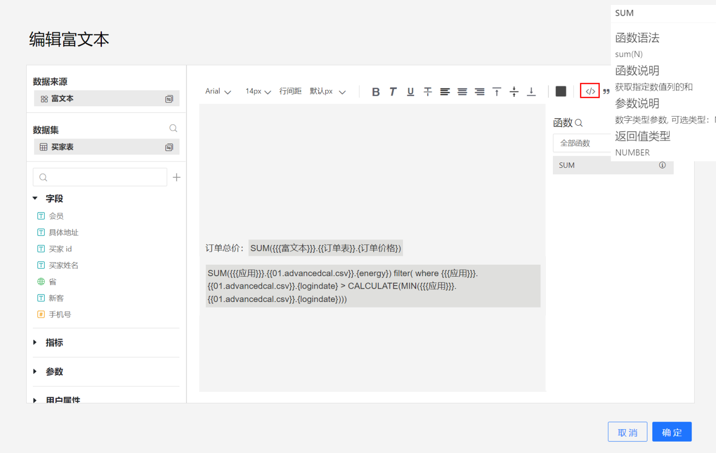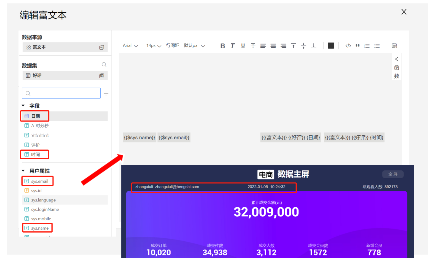 2.使用数据集字段、指标、参数以及用户属性作为富文本内容。直接点击左侧字段名称,即可添加到富文本中。