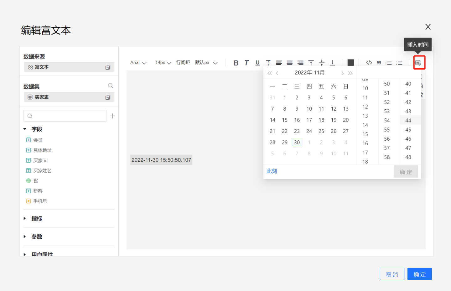 富文本中插入时间为静态时间。 如果展示动态时间,请使用 TODAY()、NOW()等时间函数。将 TODAY()、NOW()等函数添加到数据集字段中,在富文本中引用相应的字段即可实现动态时间。