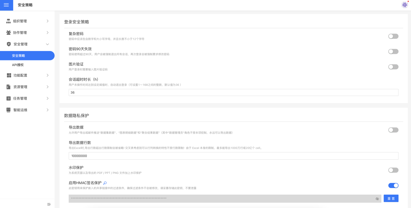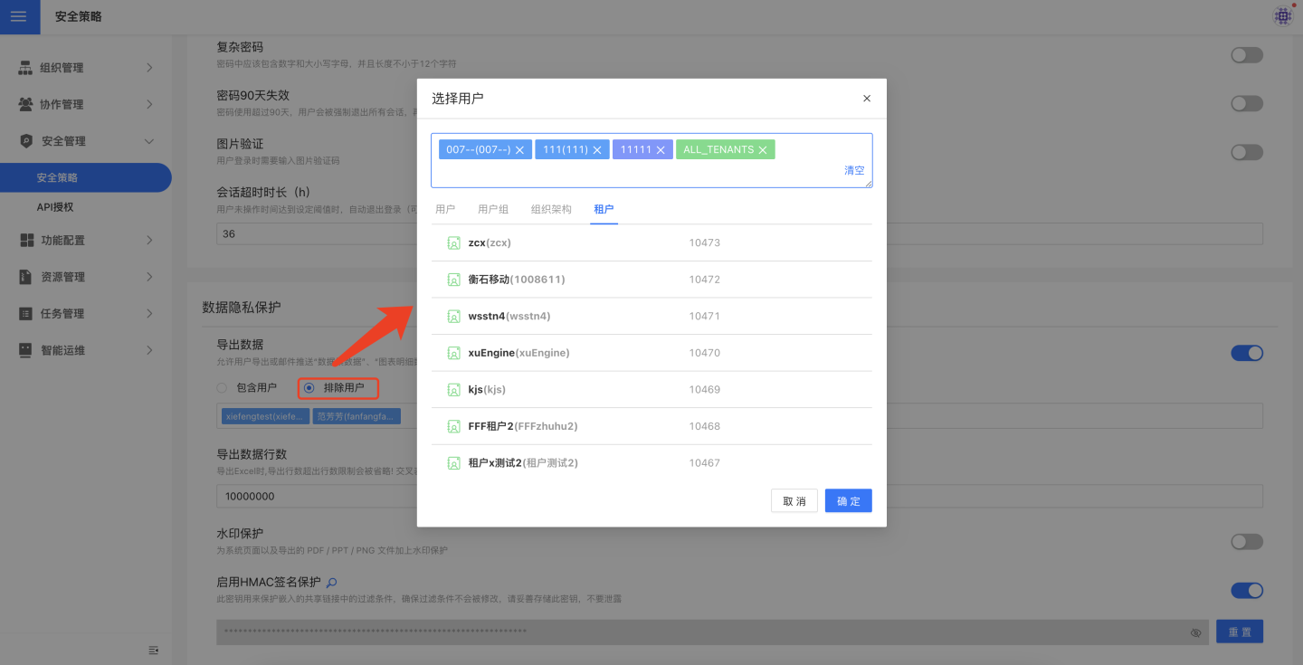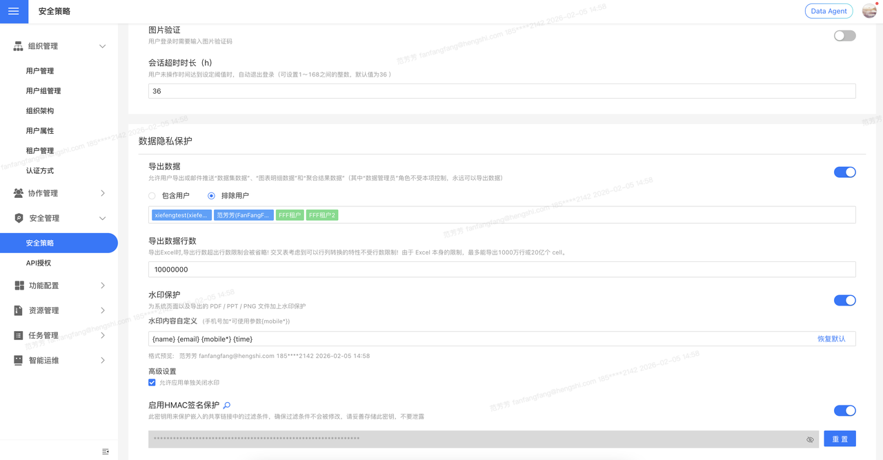默认开启,允许用户导出或邮件推送数据集数据、图表明细数据和聚合结果数据。可以设置哪些用户能够导出数据,哪些用户不能导出数据。