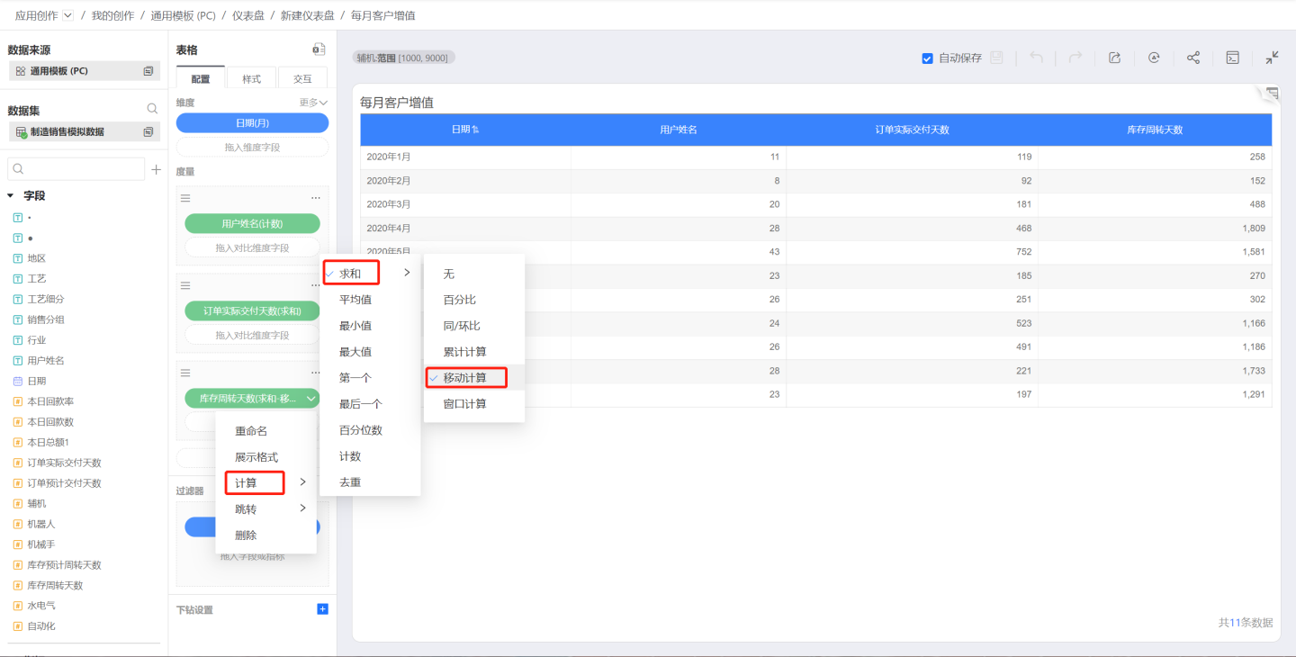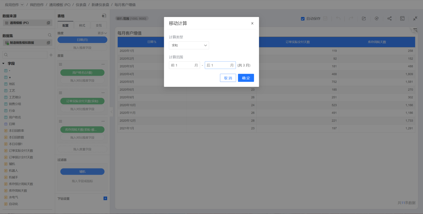 移动计算是计算范围内的数据按照计算类型进行计算。只有日期做维度时,才能进行移动计算,并且要求日期维度的计算方式为:毫秒、秒、分、时、天、周、月、季度、年时。如果日期维度的计算方式为:天(跨周)、天(跨月)、月(跨年)、季度(跨年)时,度量不能进行移动计算。