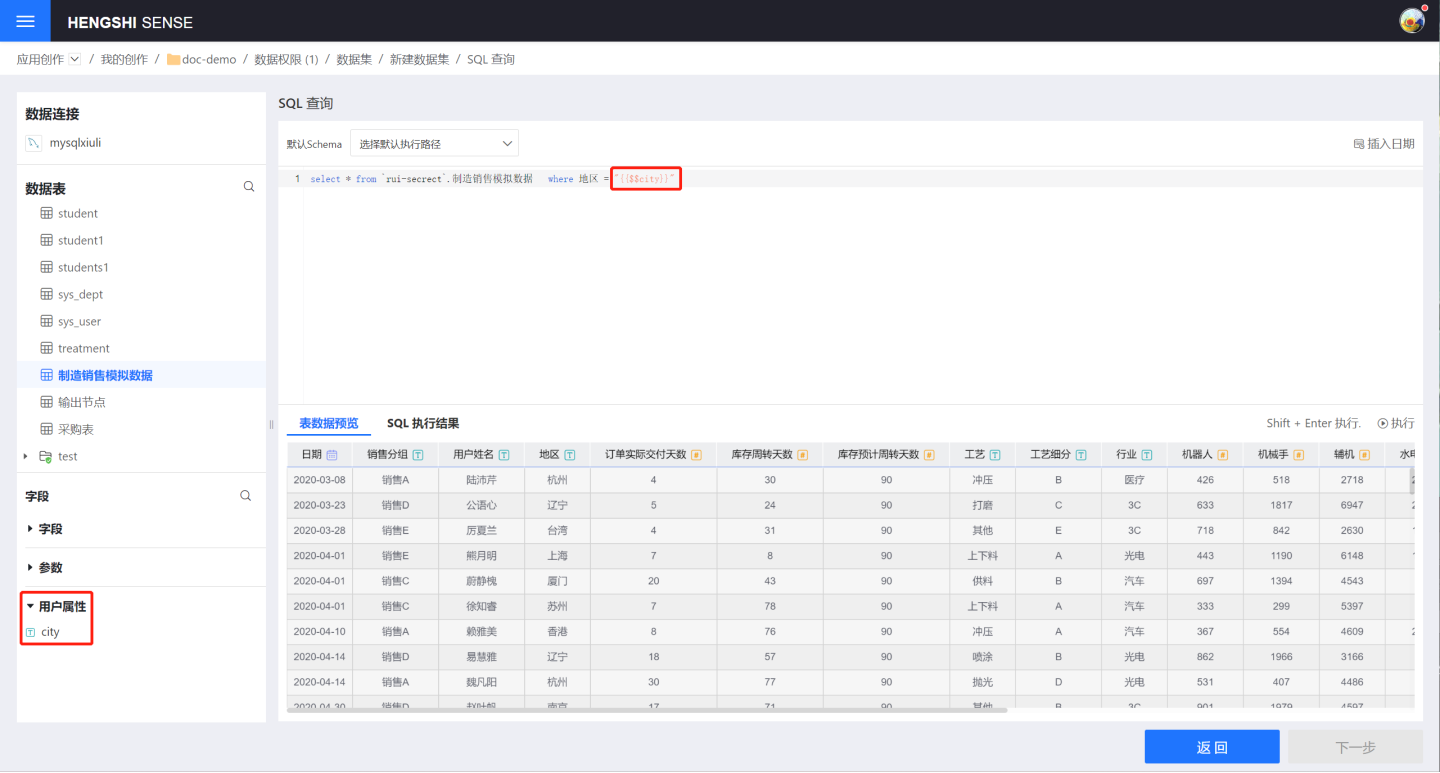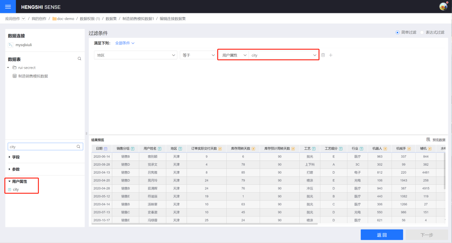 5. 从上面步骤可以看出在数据创建(示例中演示的是数据集创建过程,还包括新增字段、原子指标、参数等数据创建)过程使用用户属性对数据内容进行控制以达到对不同用户展示不同数据内容。