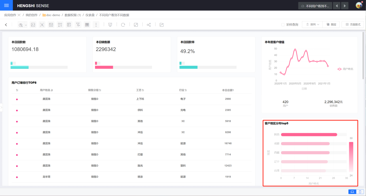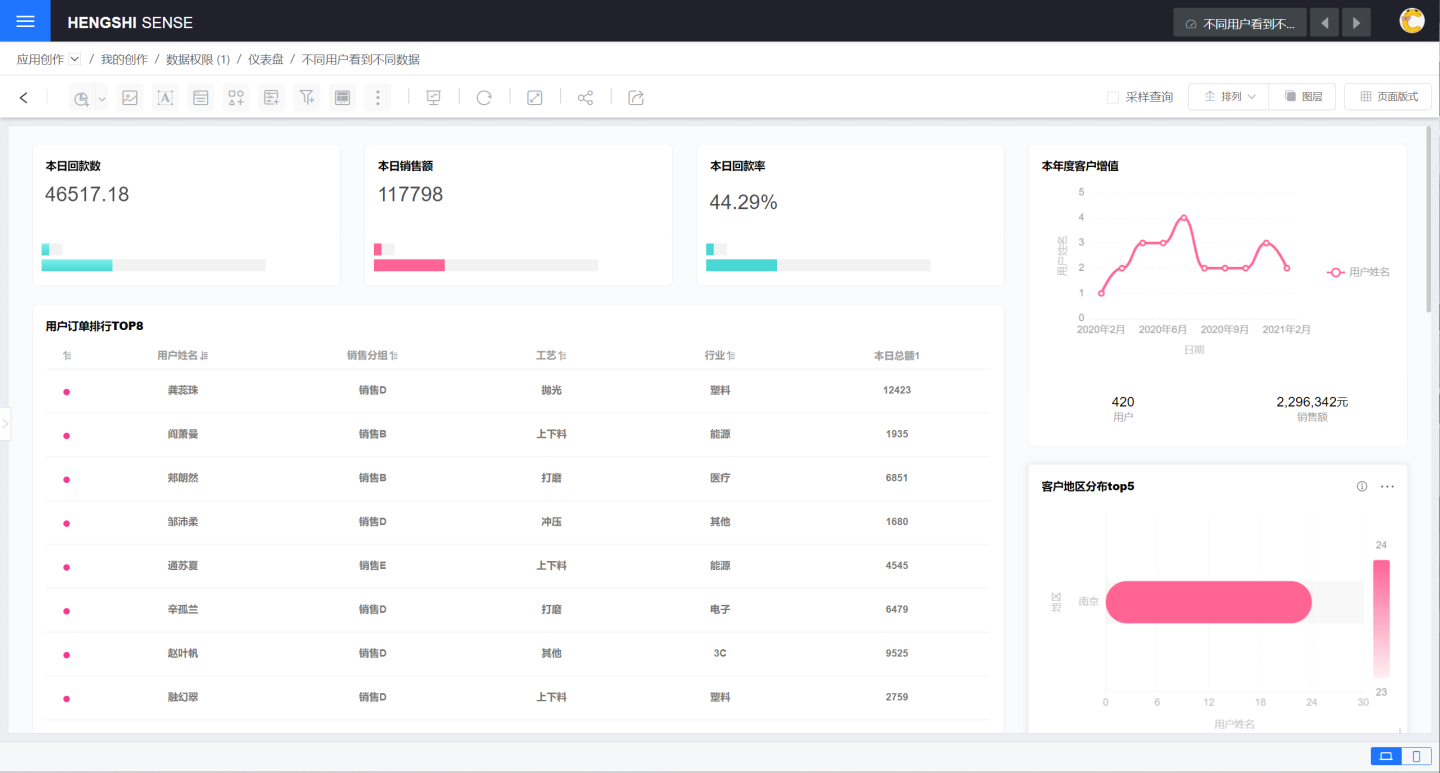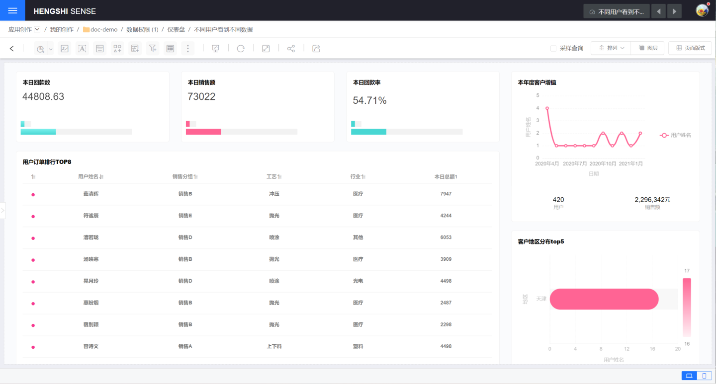 3. 分析师小王使用创建的数据集制作报表,小王的用户属性 city 是天津,所以相关报表也只看到了天津的数据信息。