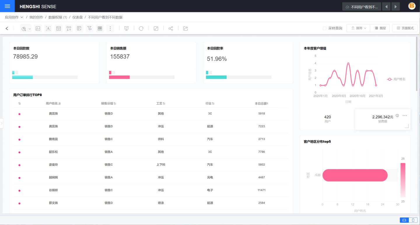 用户 B 的 city 属性是成都,查看的报表仅展示成都地区相关数据。