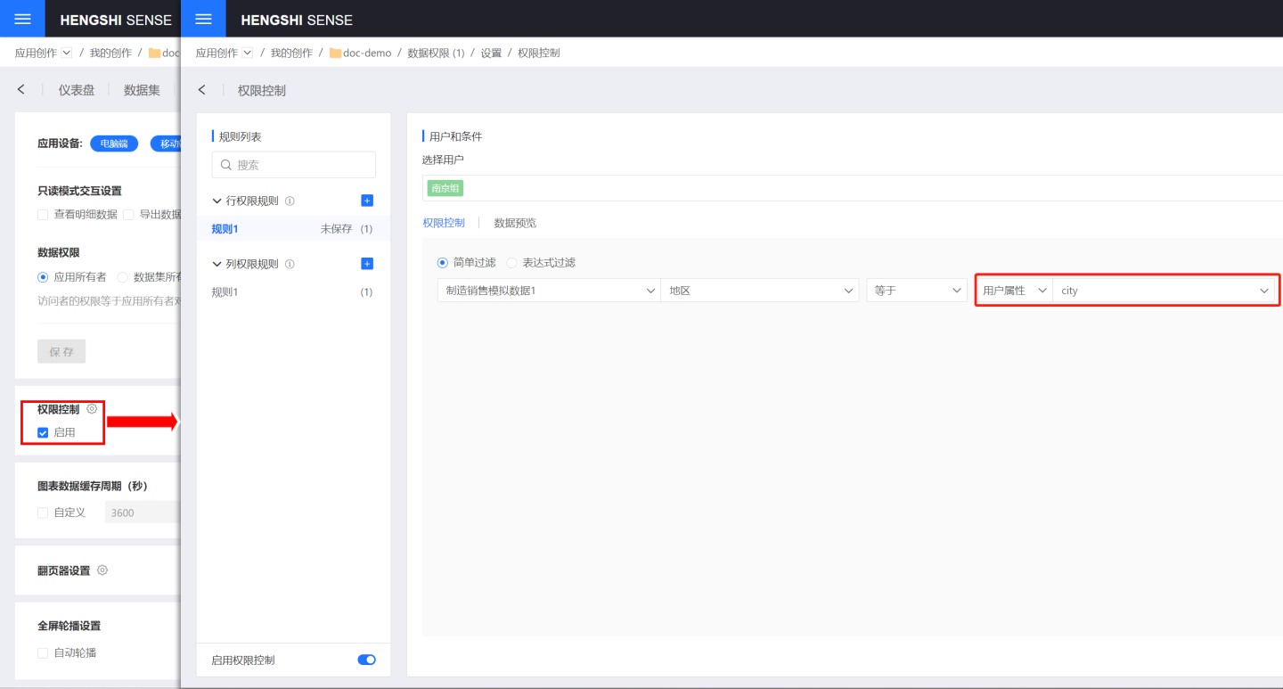 该报表要求不同城市用户只能查看自己所在城市的信息,所以分析师小王在应用设置->权限控制中对数据内容进行控制。将数据中地区的信息与用户属性 city 进行匹配,用户只能查看自己用户属性 city 匹配到的数据,即自己城市的相关数据信息。