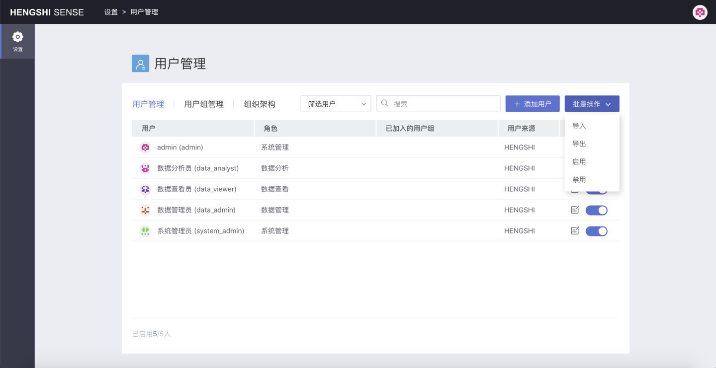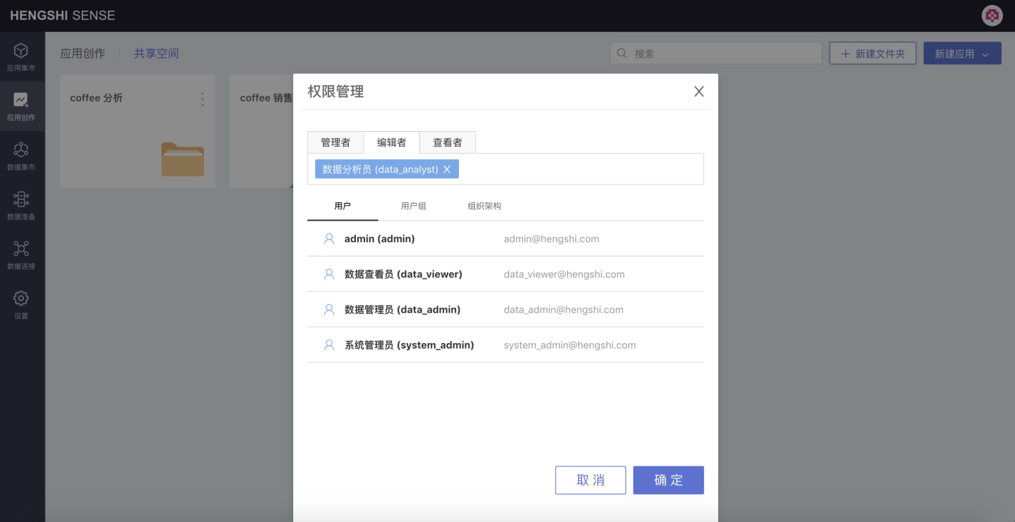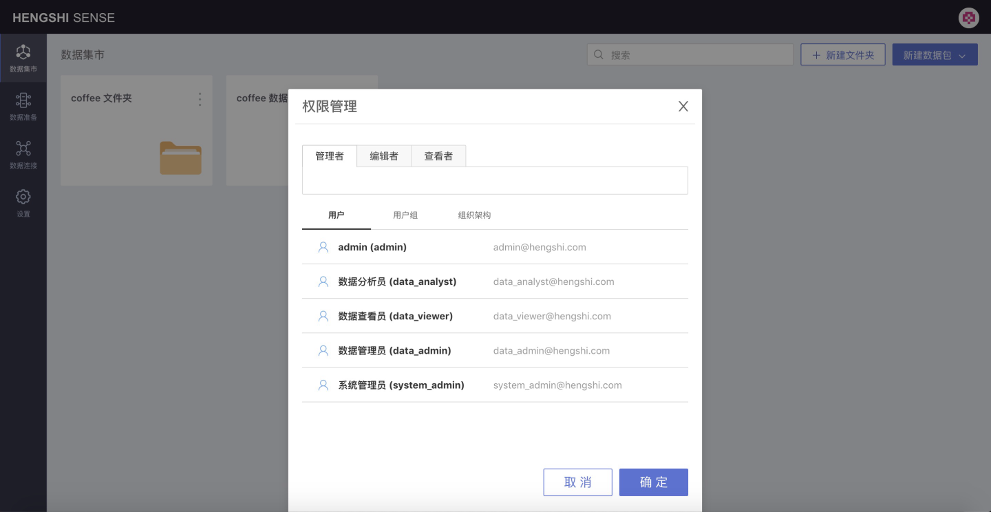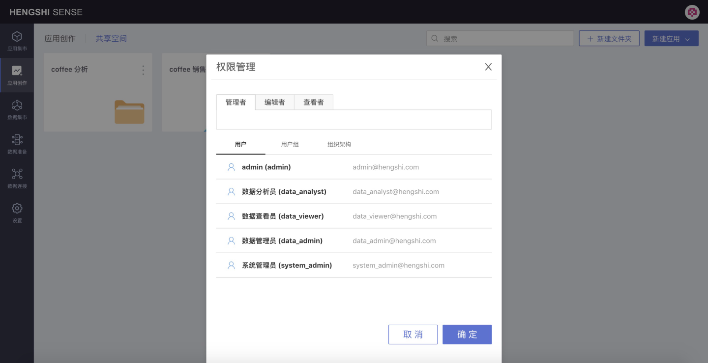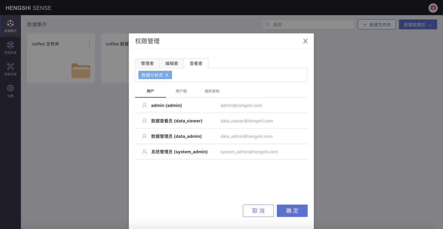 权限 用户 管理者 系统管理员(system_admin) 编辑者 数据管理员(data_admin) 查看者 数据分析员(data_analyst)