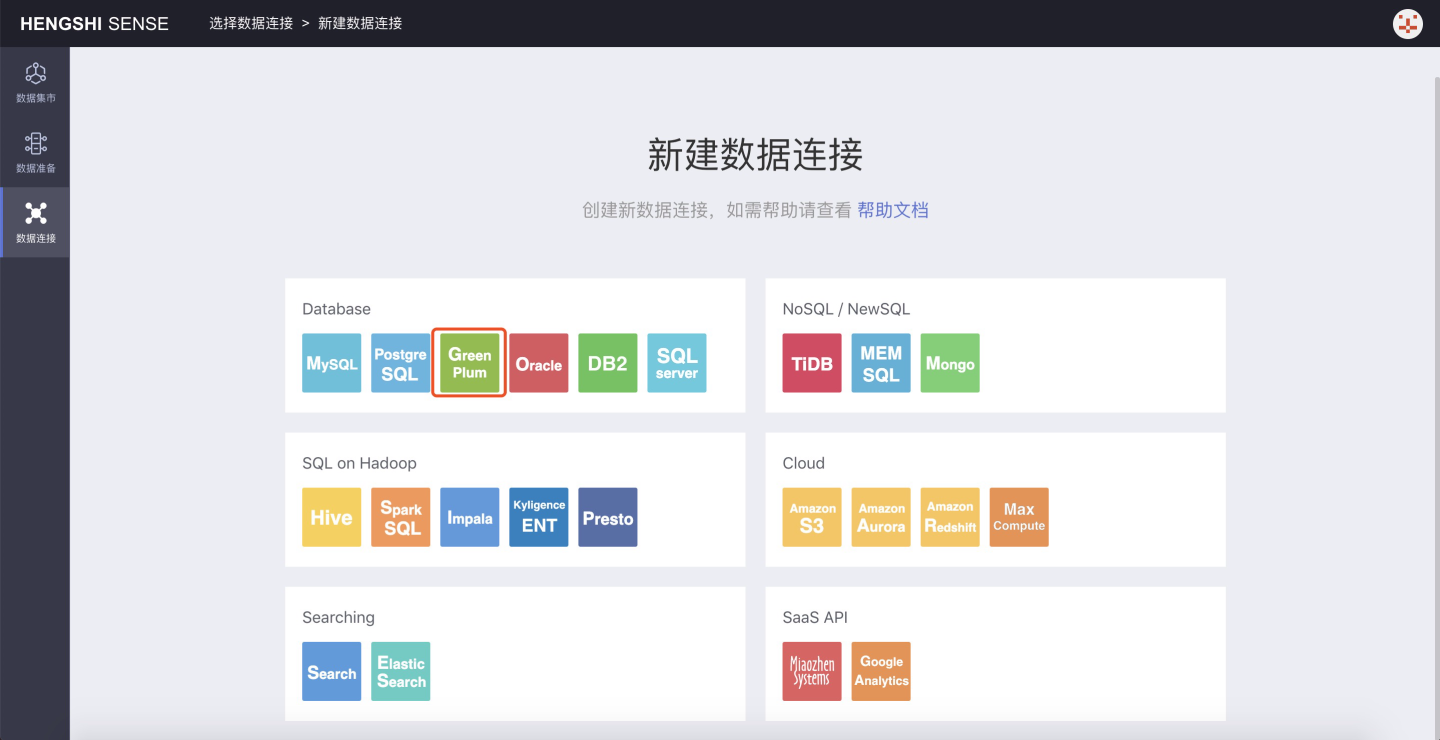 可根据自己公司的数据库选择数据连接,下面以新建 Green Plum 数据连接为例: