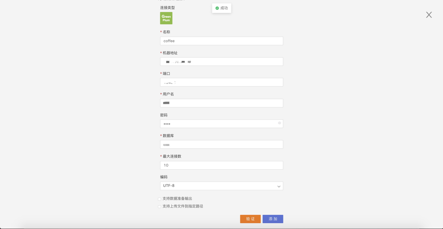 在该页面中按照要求输入连接信息,点击验证,验证通过 添加 按钮更新为绿色可点击状态: