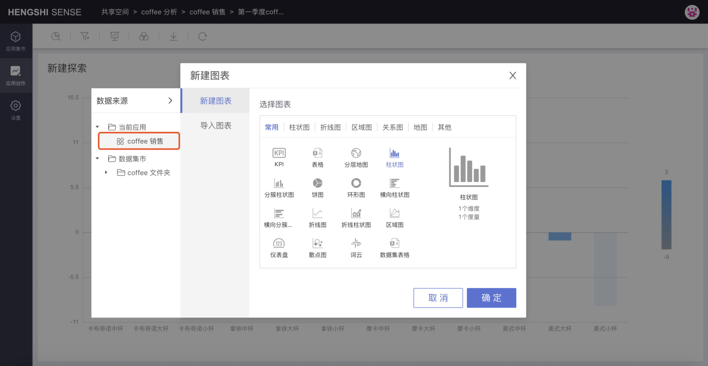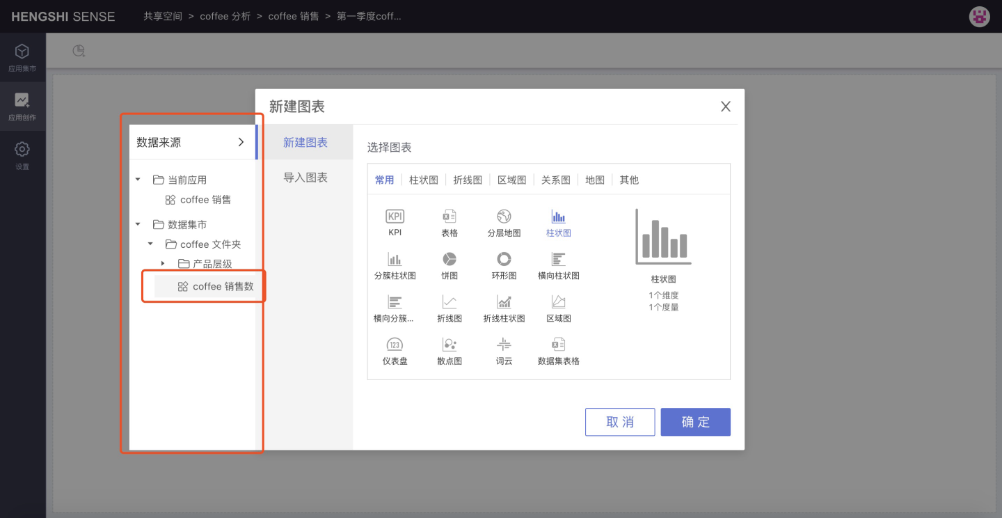 创建图表时,展开图表类型选择侧面的展开按钮,选择该图表需要使用的数据集市中的数据包,灰色为选中的状态,如下图所示,选择 coffee 销售数据 数据包: