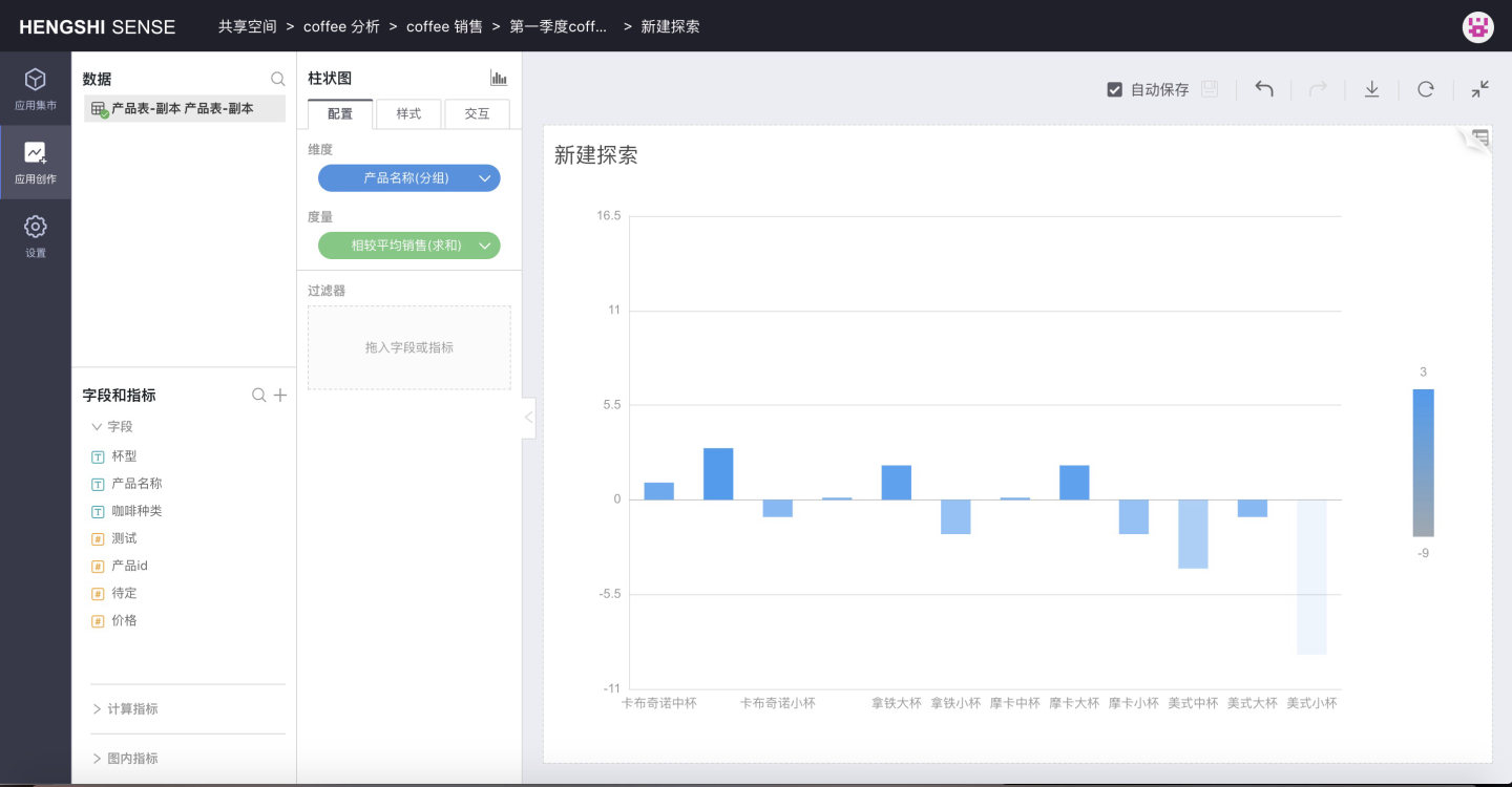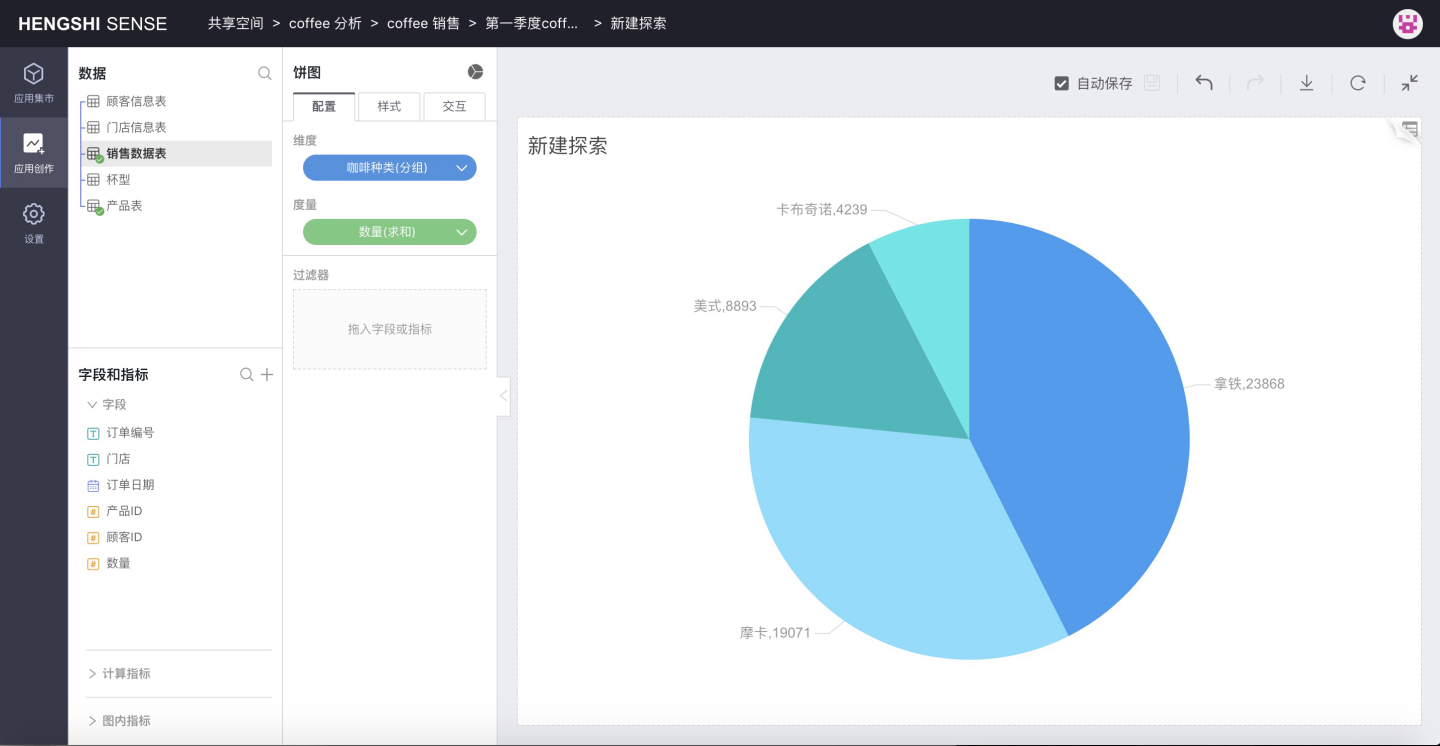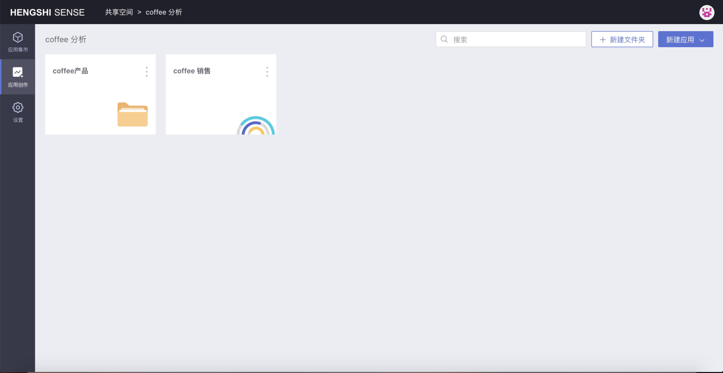如下图所示,在 coffee 分析 中新建文件夹 coffee 产品、新建应用 coffee 销售:
