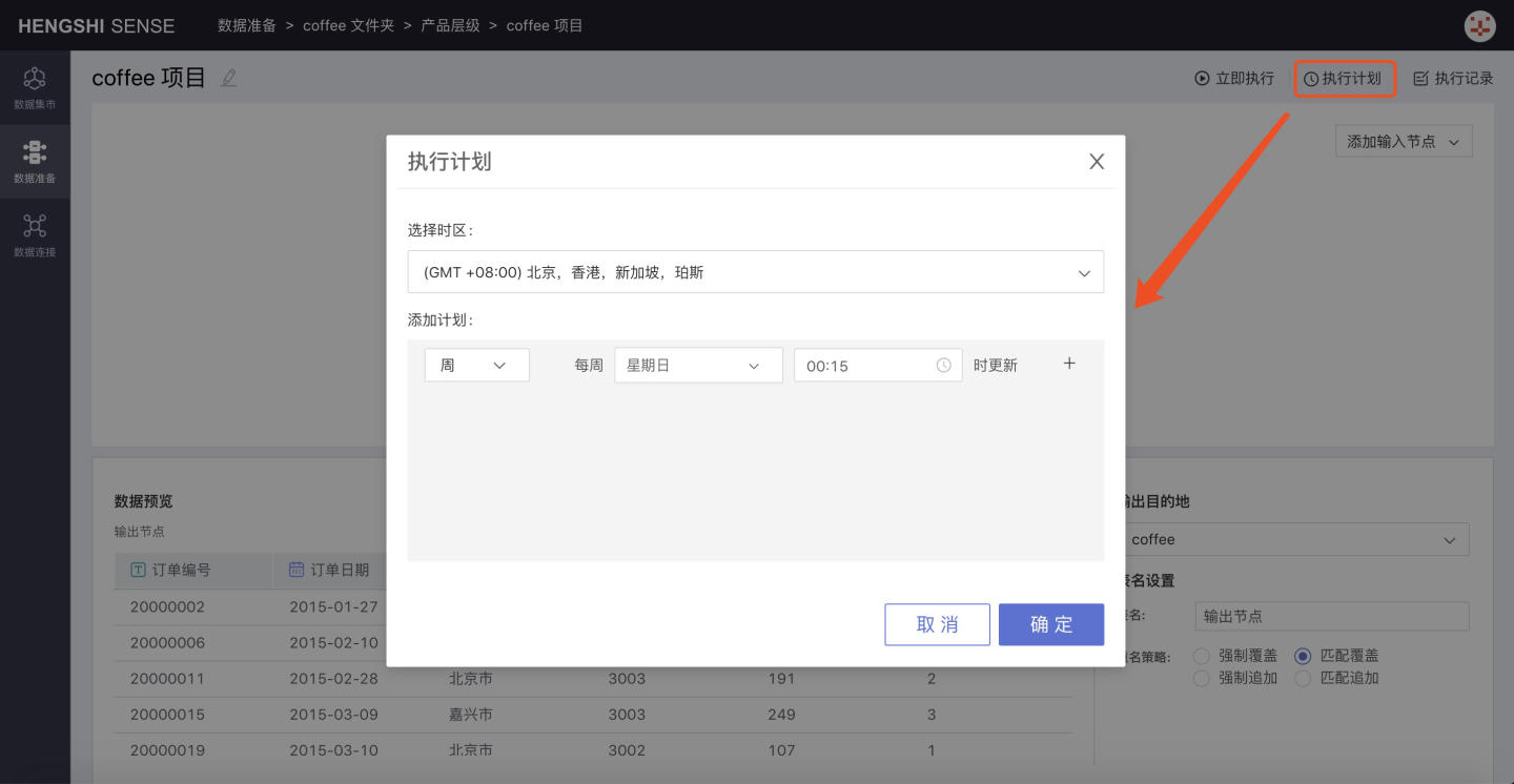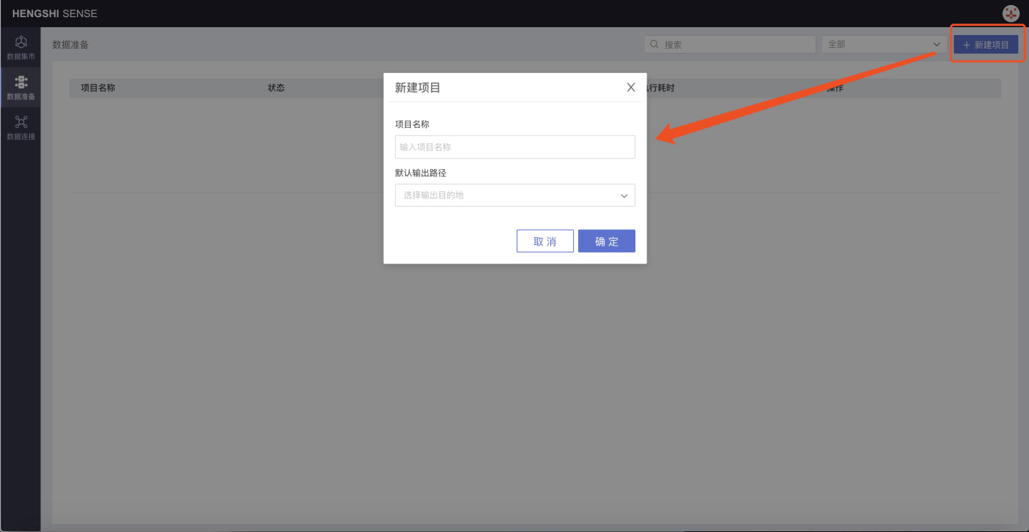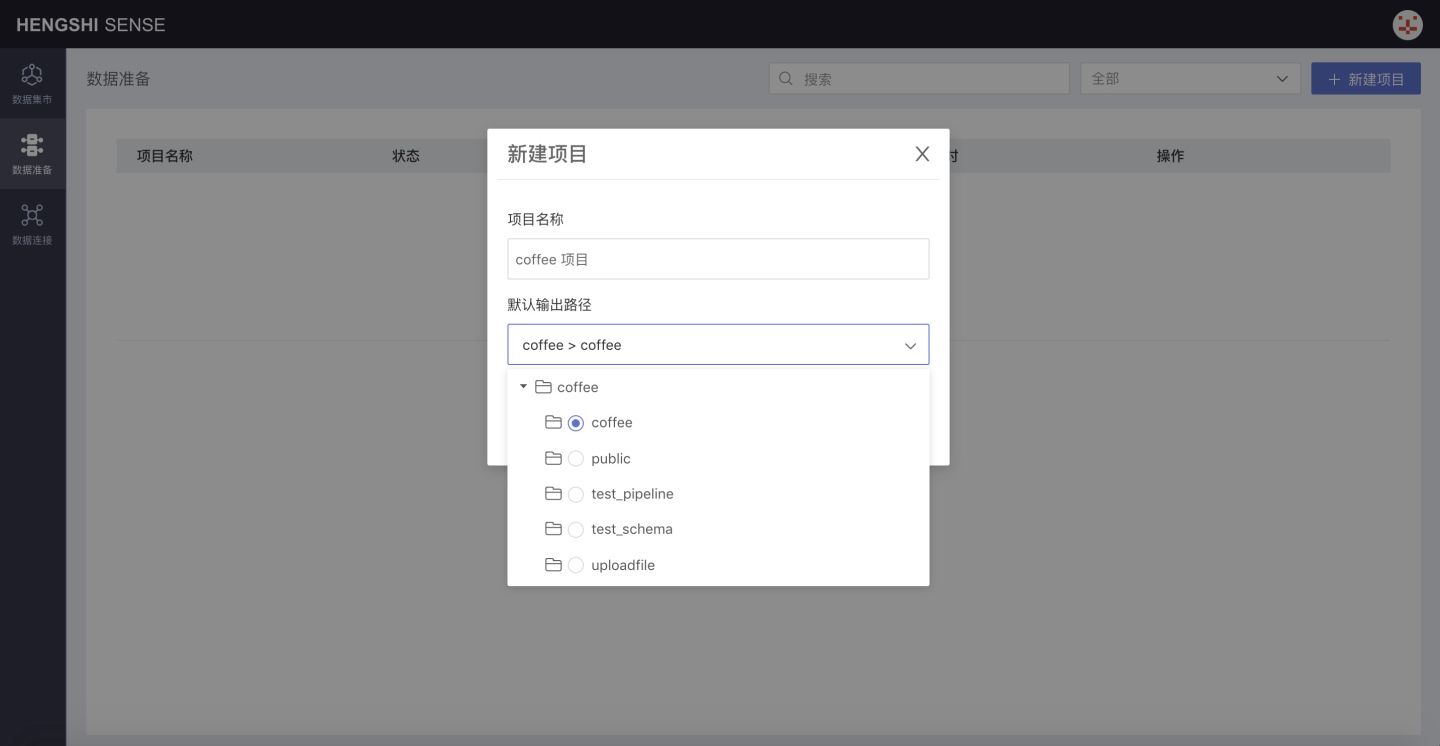 在弹窗中输入项目名称、在默认输出路径下拉框中的可选数据连接中指定数据库作为项目的默认输出路径。