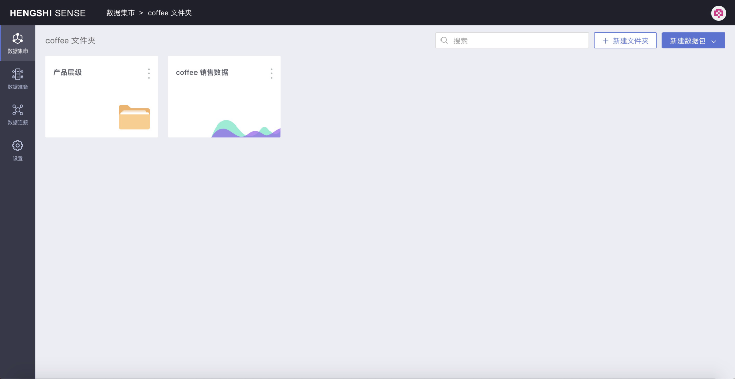 在文件夹中,可以按照需要的层级结构继续创建文件夹或者数据包,如上图所示,新建文件夹 产品层级 ,新建数据包 coffee 销售数据 。
