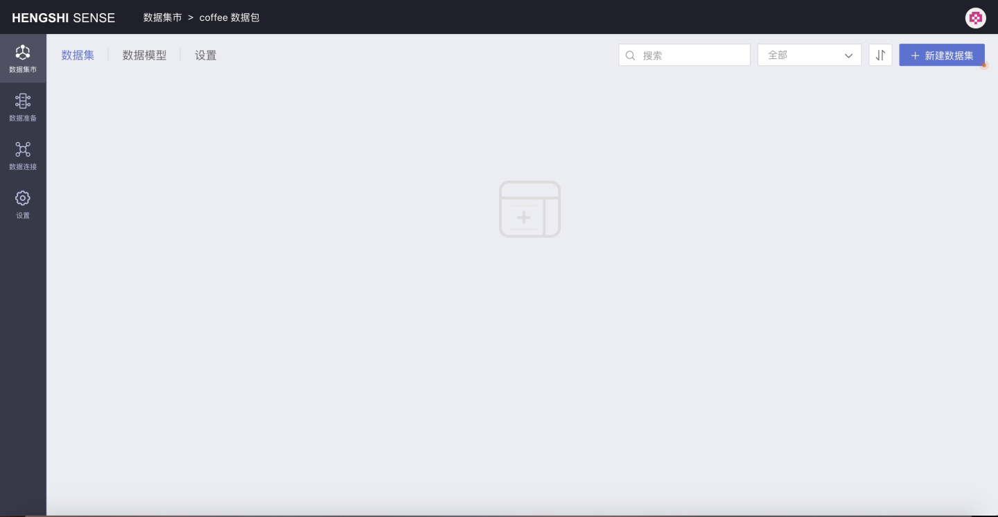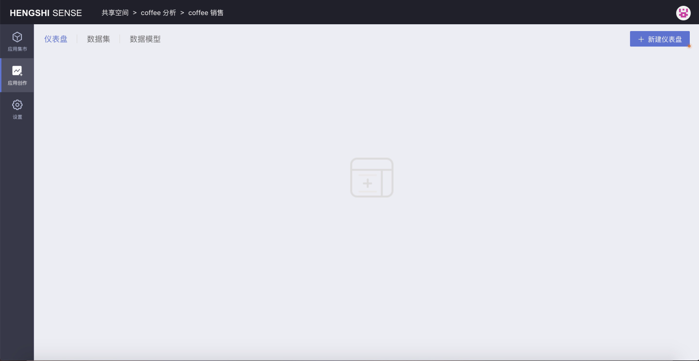 在 coffee 销售 应用中可以 新建仪表盘、新建数据集、数据模型、以及数据处理等: