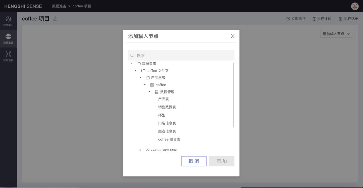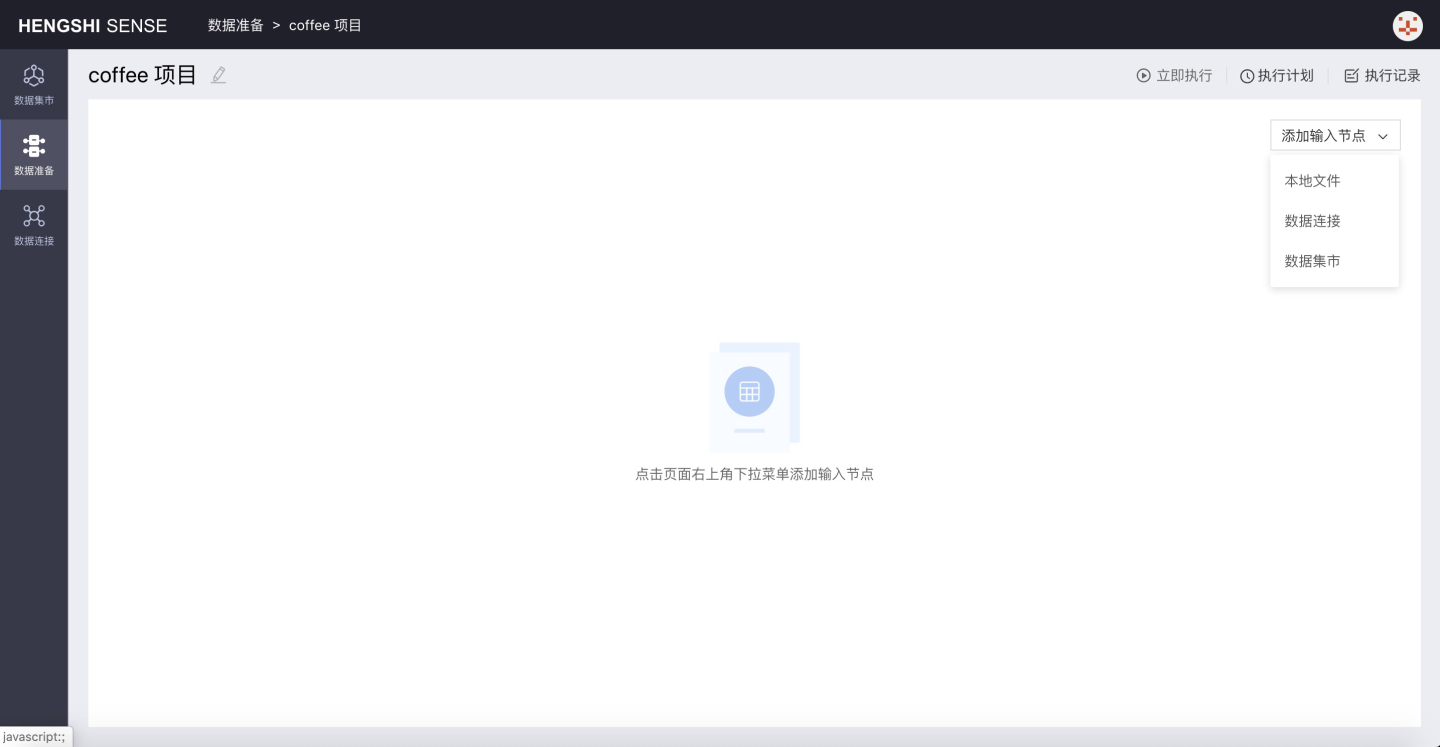 新建项目后默认打开该项目,界面右上角有添加输入节点的下拉框,在下拉框中选择要添加的输入节点的类型,包括:本地文件、数据集市、数据连接: