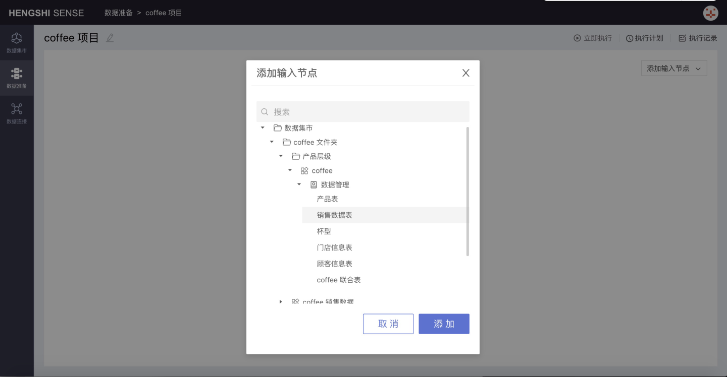 数据连接 添加数据连接中的表为输入节点时,分为内置数据连接和用户数据连接