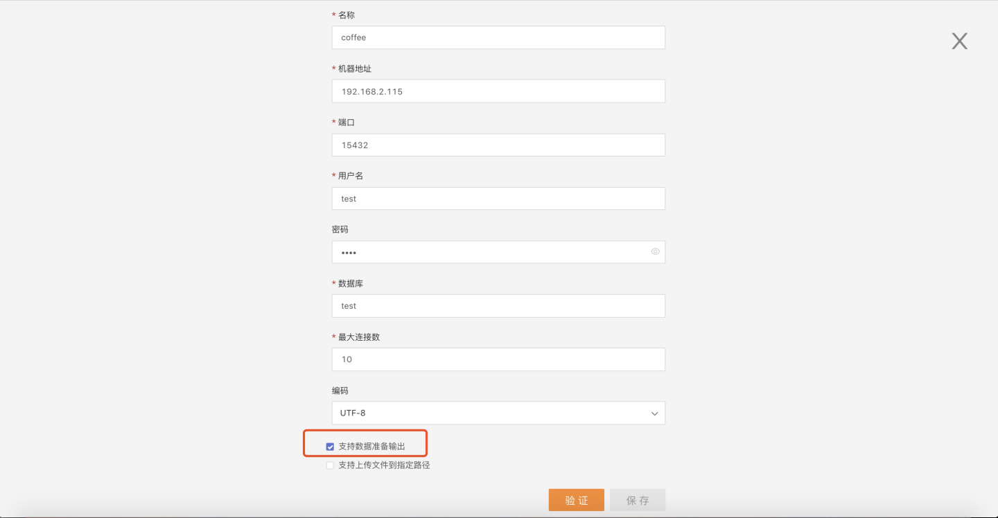 以新建的连接 coffee 为例,编辑连接,勾选支持数据集成输出,验证并保存: