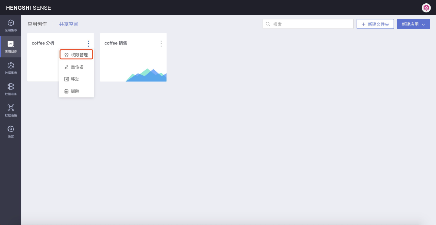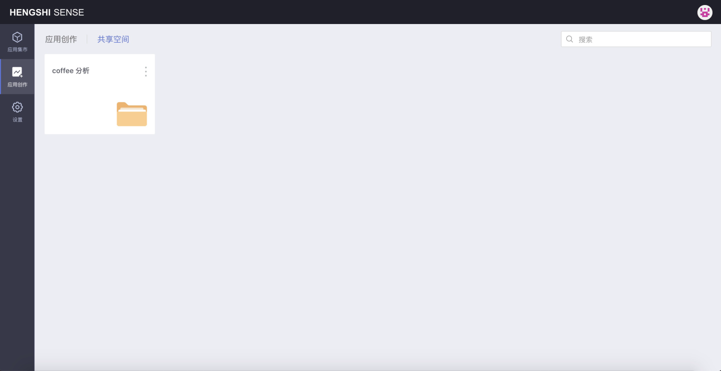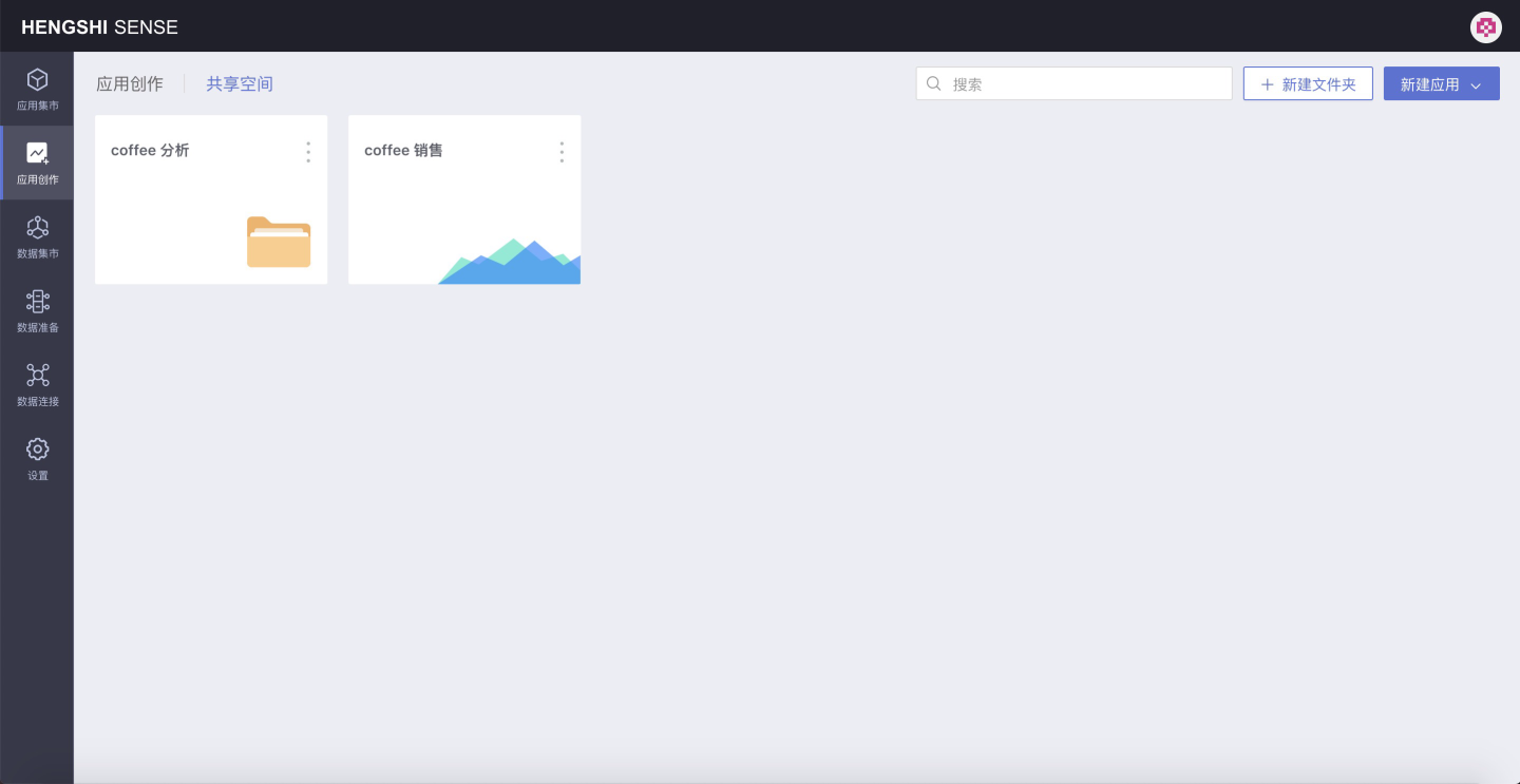 如上图所示,可以在 团队空间 的首页创建文件夹和应用,上图中为已经创建额文件夹 coffee 分析 以及创建的应用 coffee 销售。