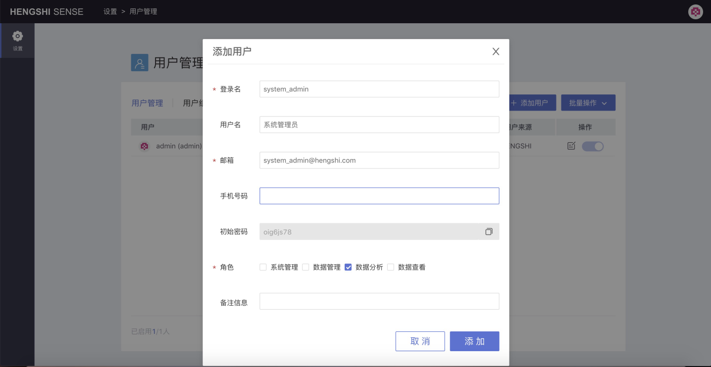 数据分析,可通过勾选各角色前的复选框,为用户选择一个或多个角色。在新增用户时,会生成一个舒适密码