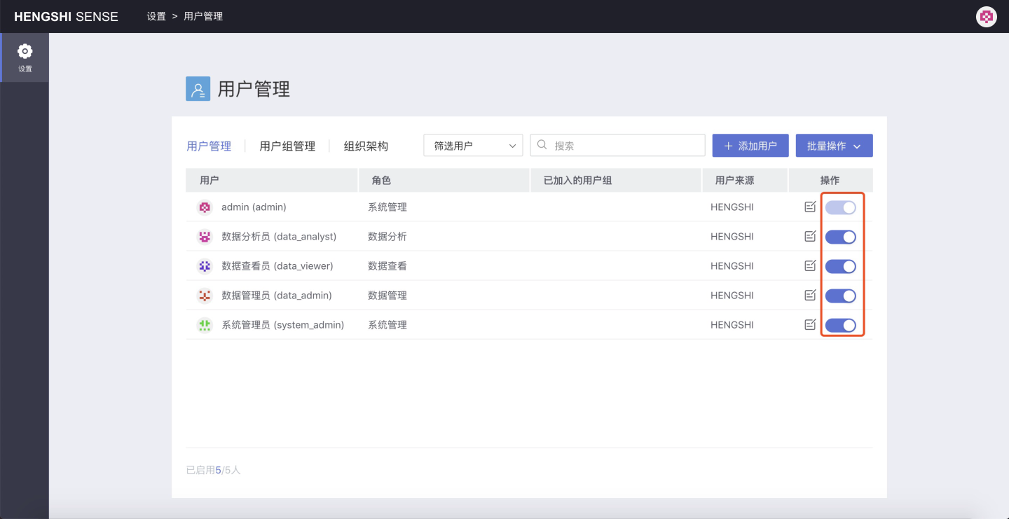 操作中的开启关闭按钮,可启用、禁用账户,同编辑用户信息时的账号状态意义相同。批量操作