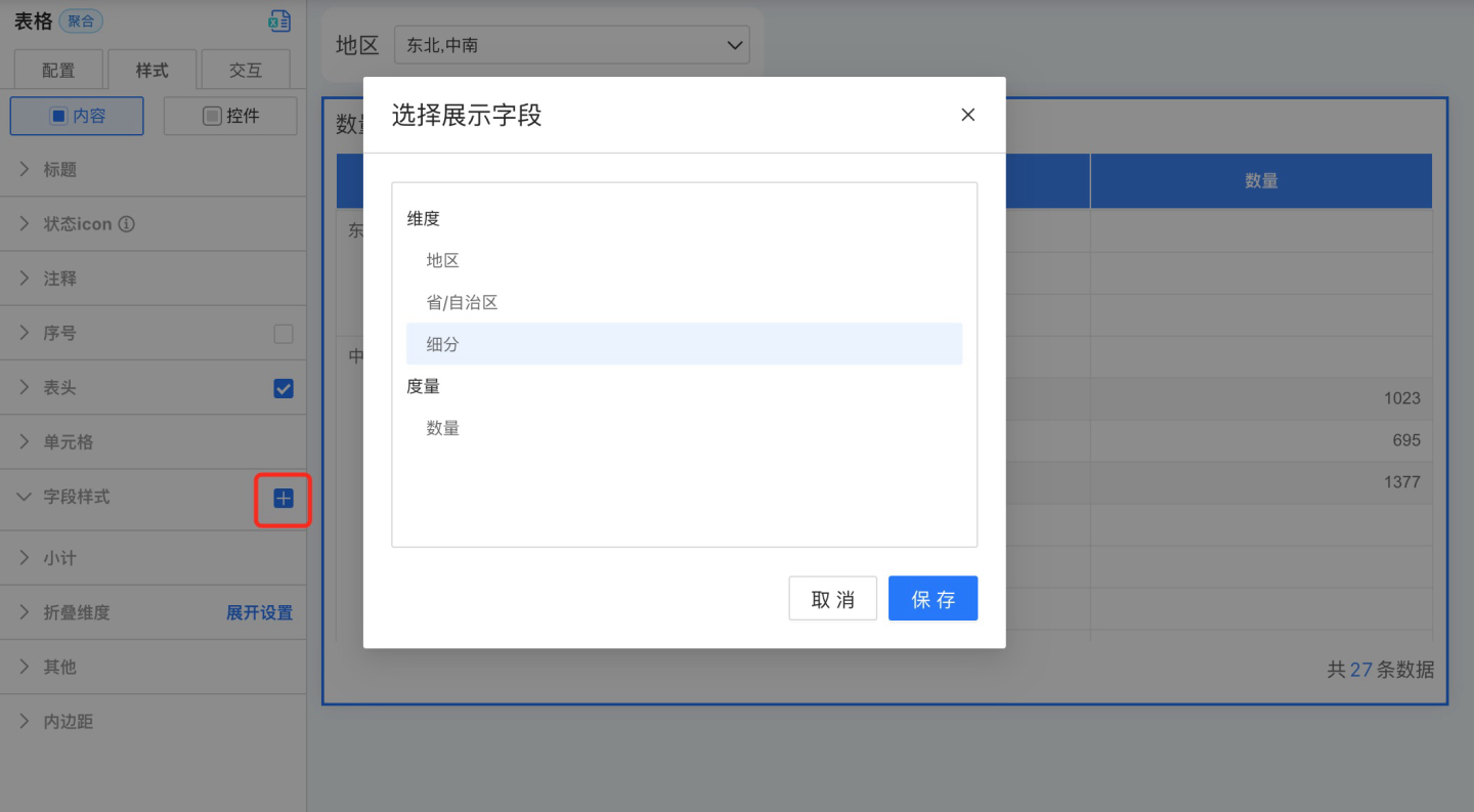 点击字段样式右侧的 “+” 号,进入选择字段弹窗,选择需要设置列样式的字段,可以选择多个字段。