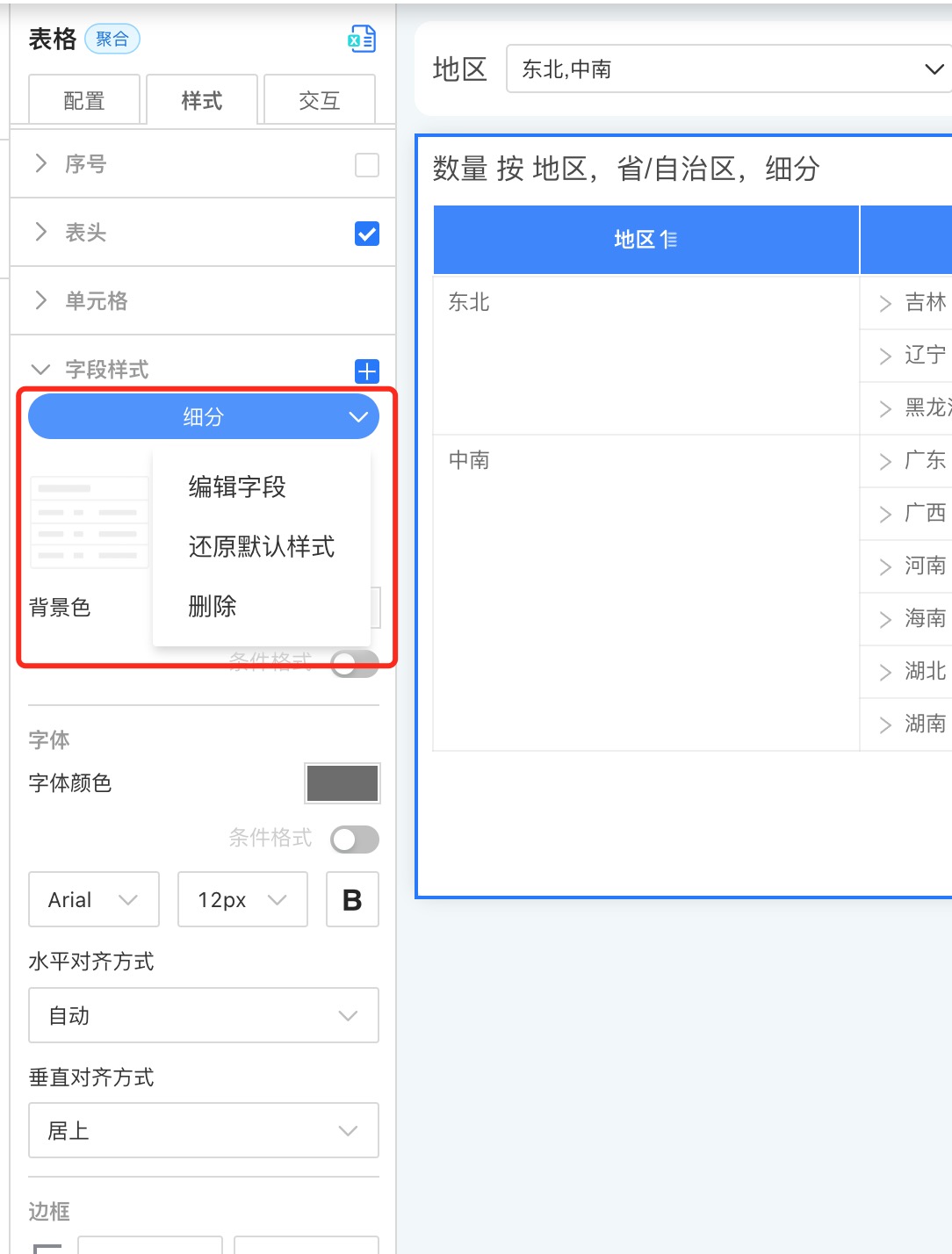 单元格的设置是针对整个表格中所有单元格,如果要对某一列或者某几列进行特殊设置时,可以在字段样式中进行设置。