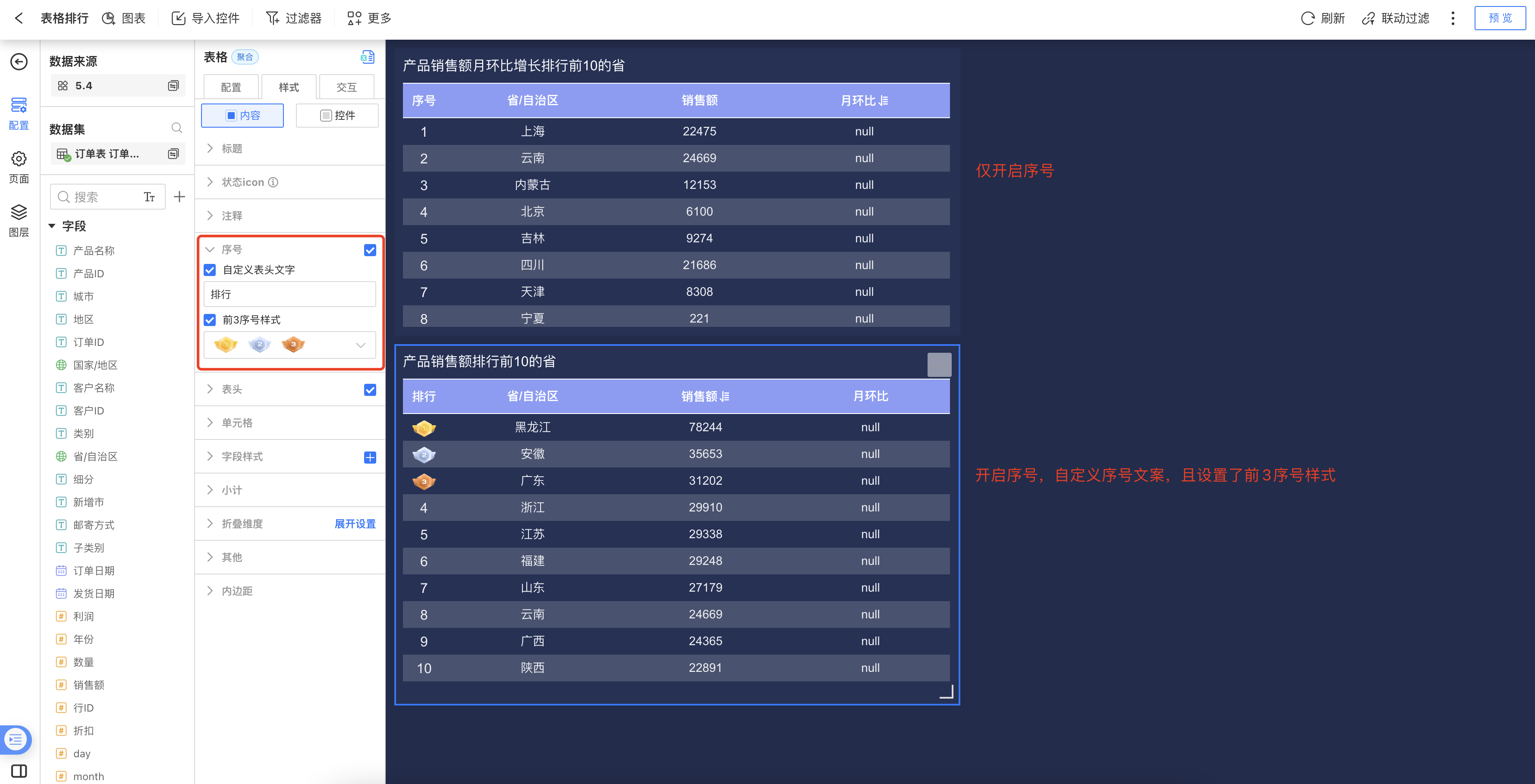 数据分析师使用表格制作数据图表,想要实现排行榜展示效果,可以对排行前3的数据项设置序号样式。配置路径:样式>内容>序号>前3序号样式。