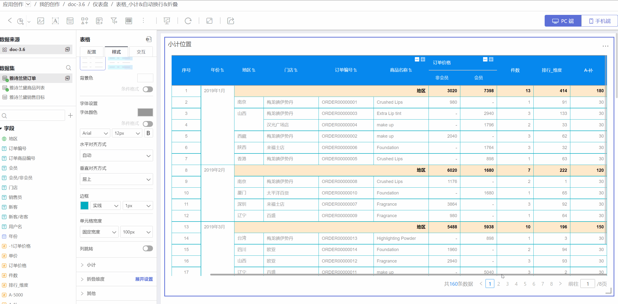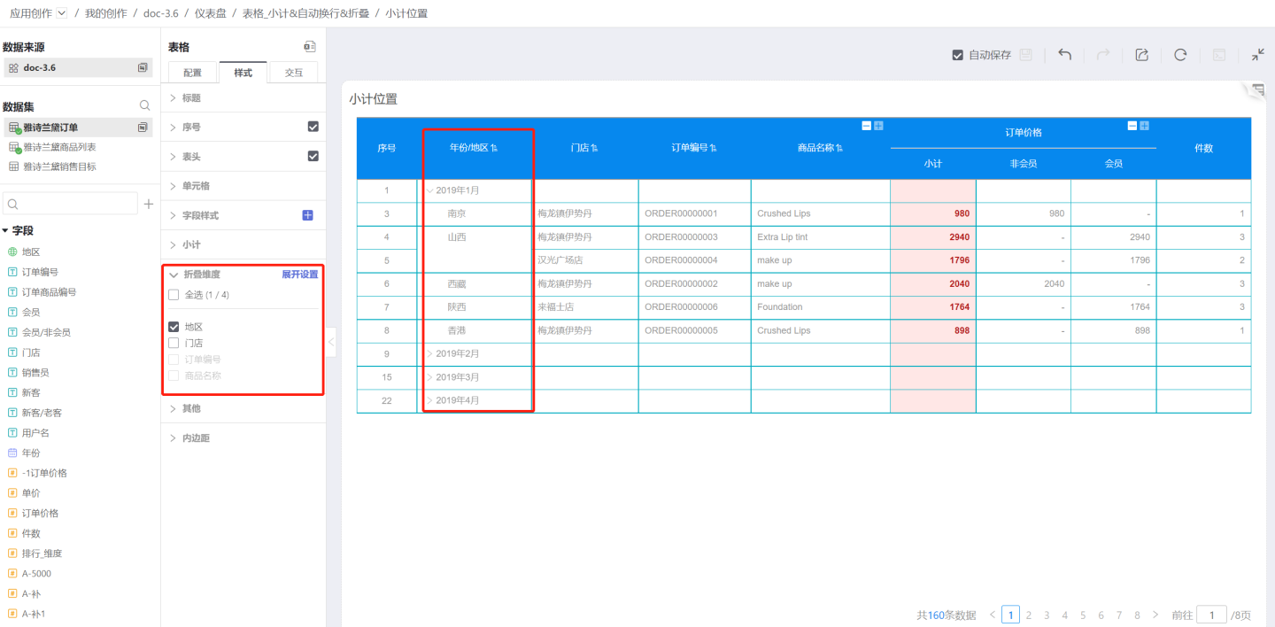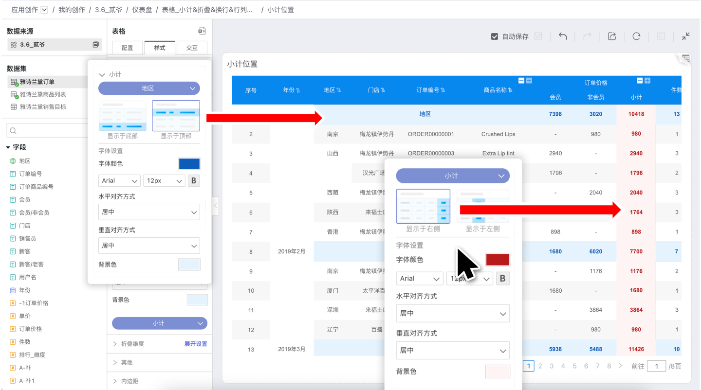 - 维度小计的位置支持设置在顶部或底部。示例中地区的小计是维度小计,位置放在了顶部。